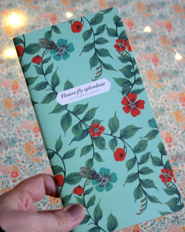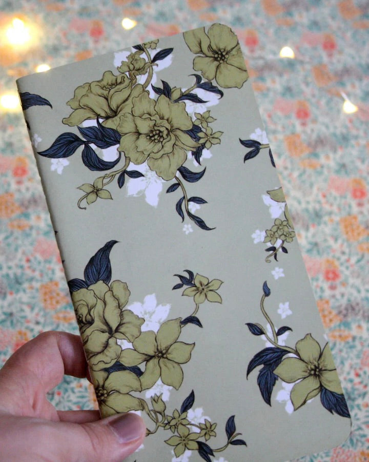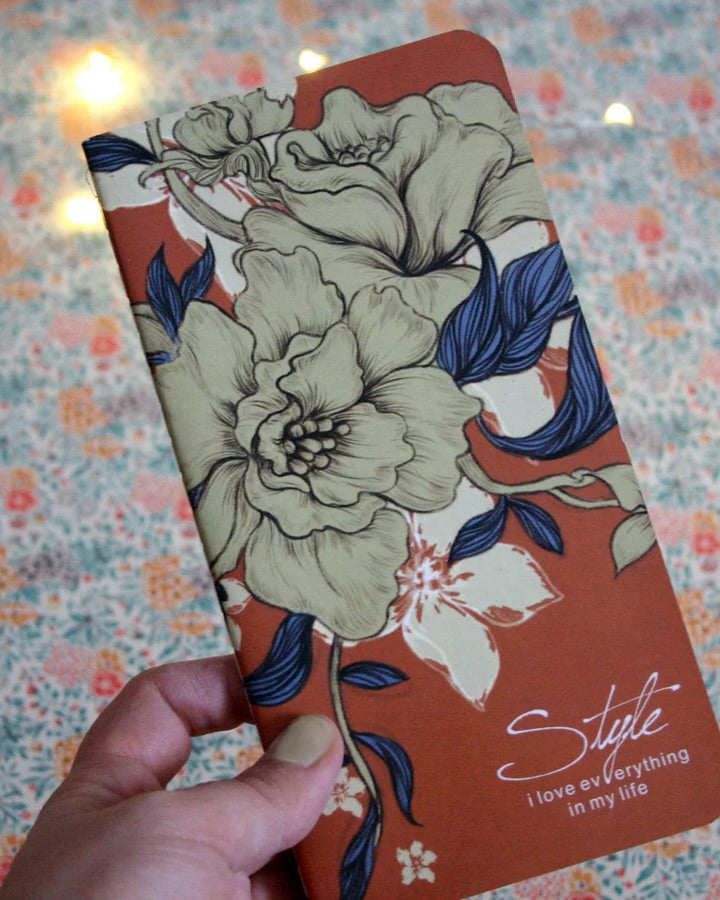 Ljuvliga anteckningsbok med vackert blommönstrat omslag.