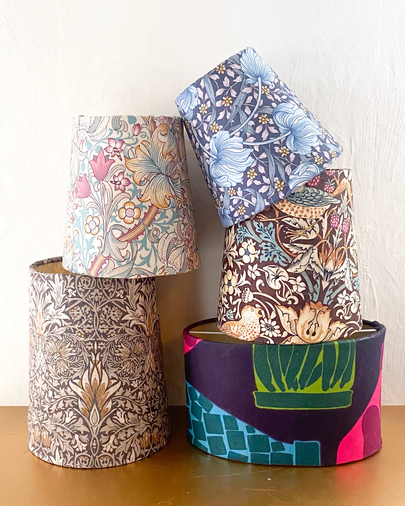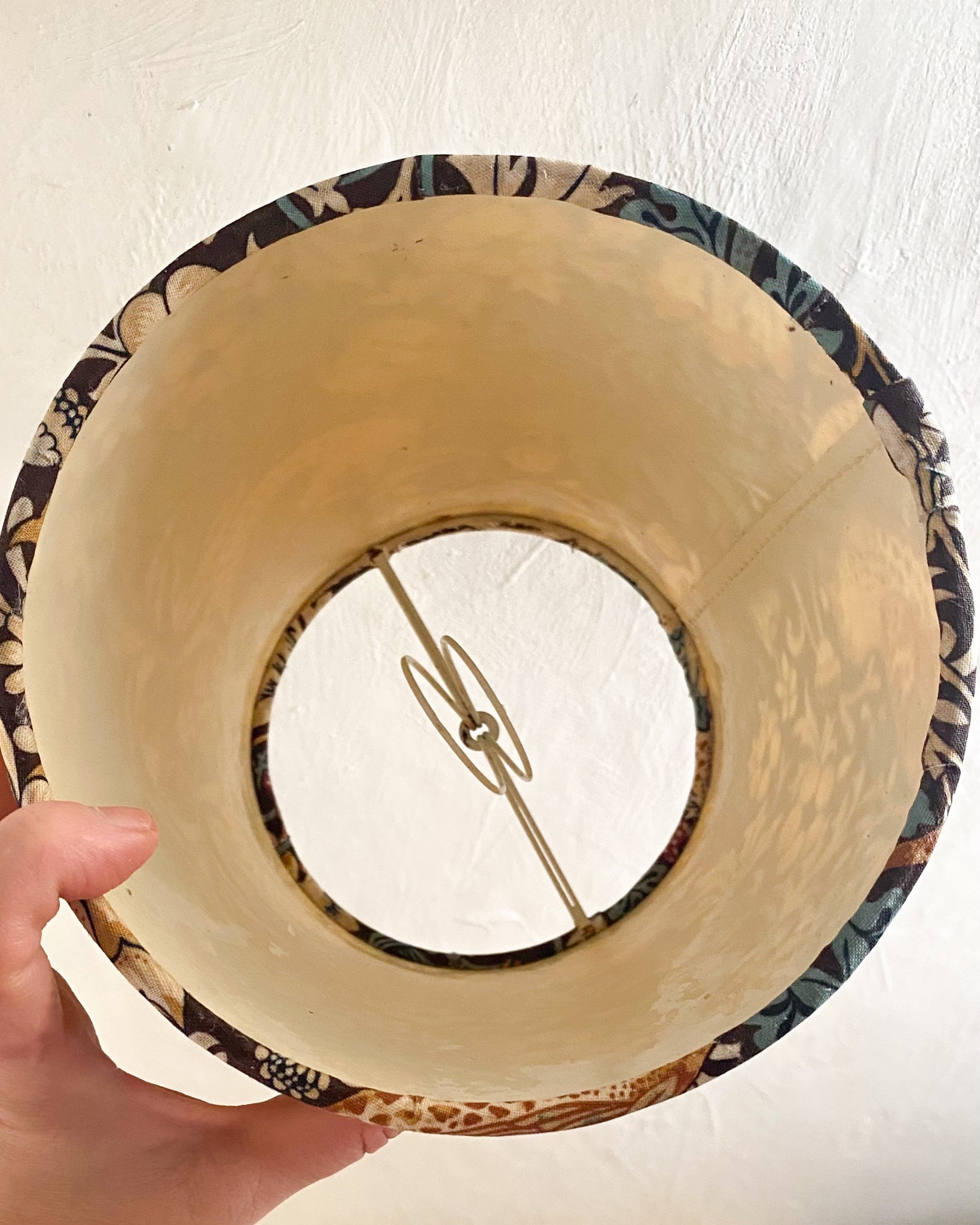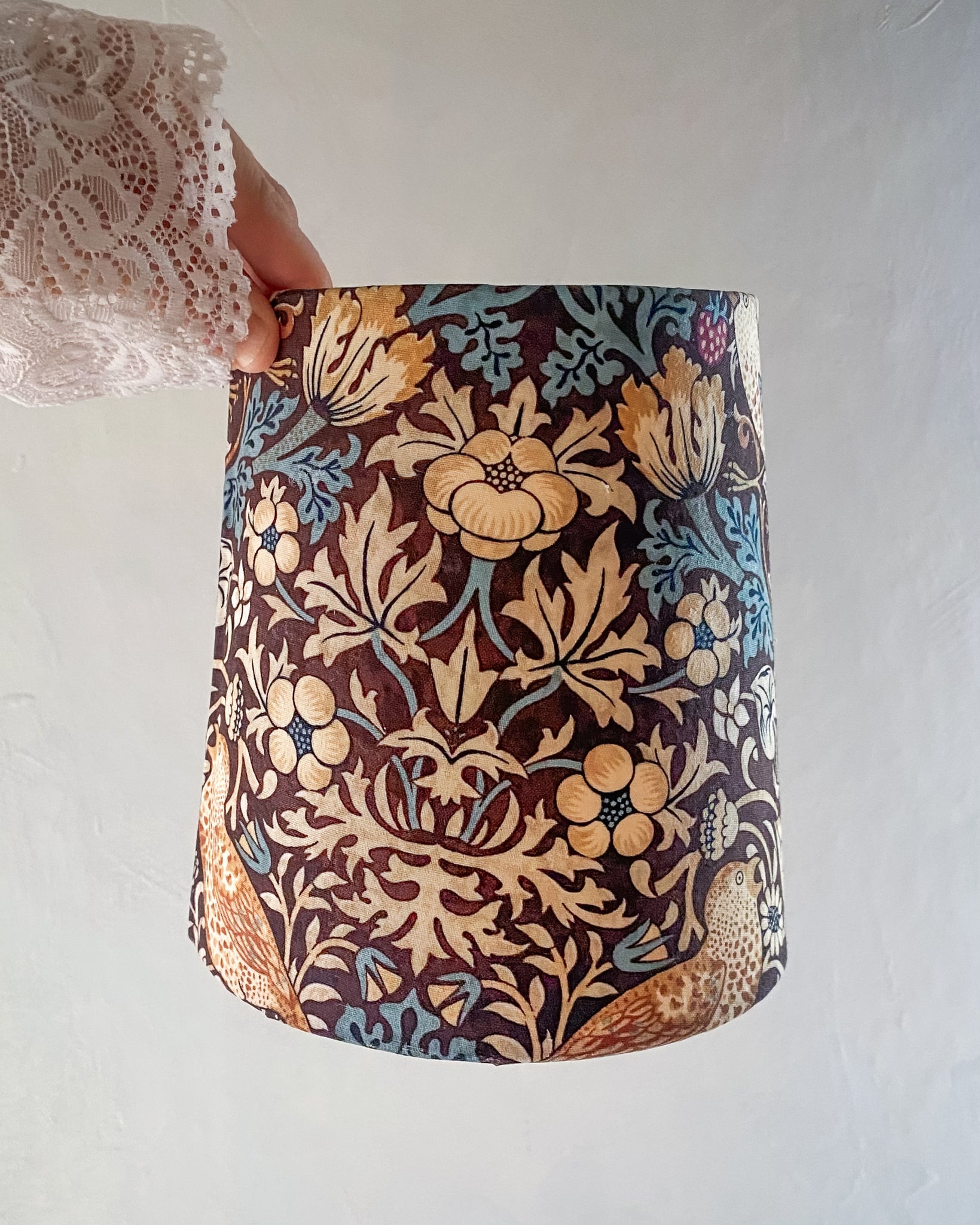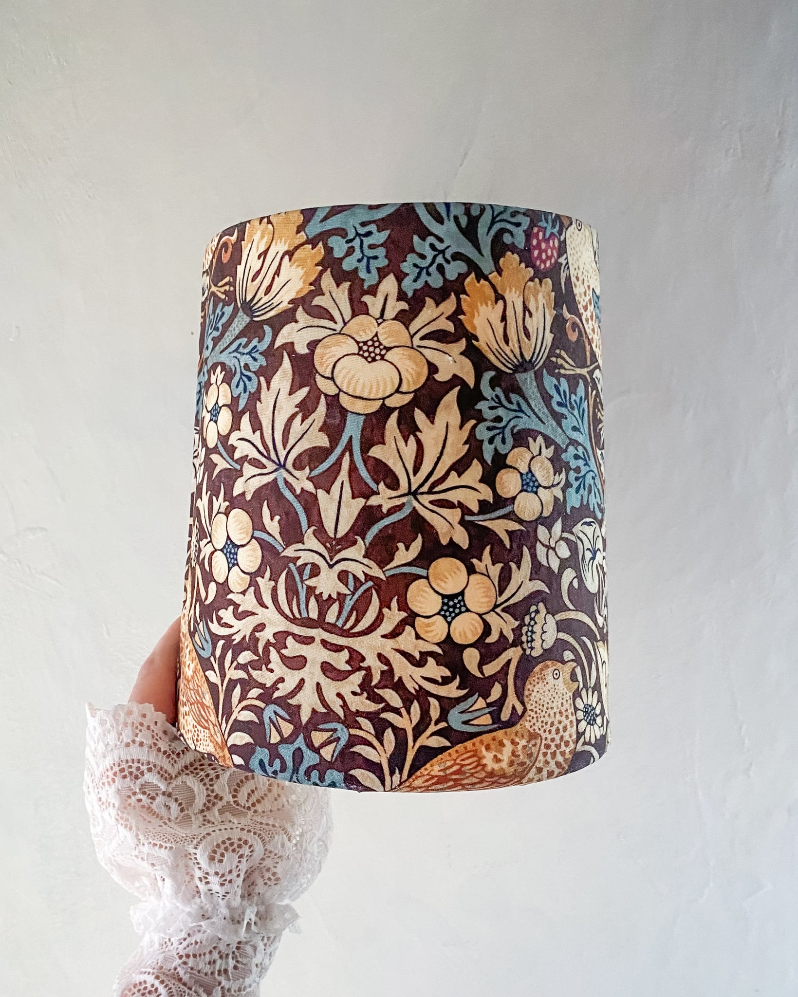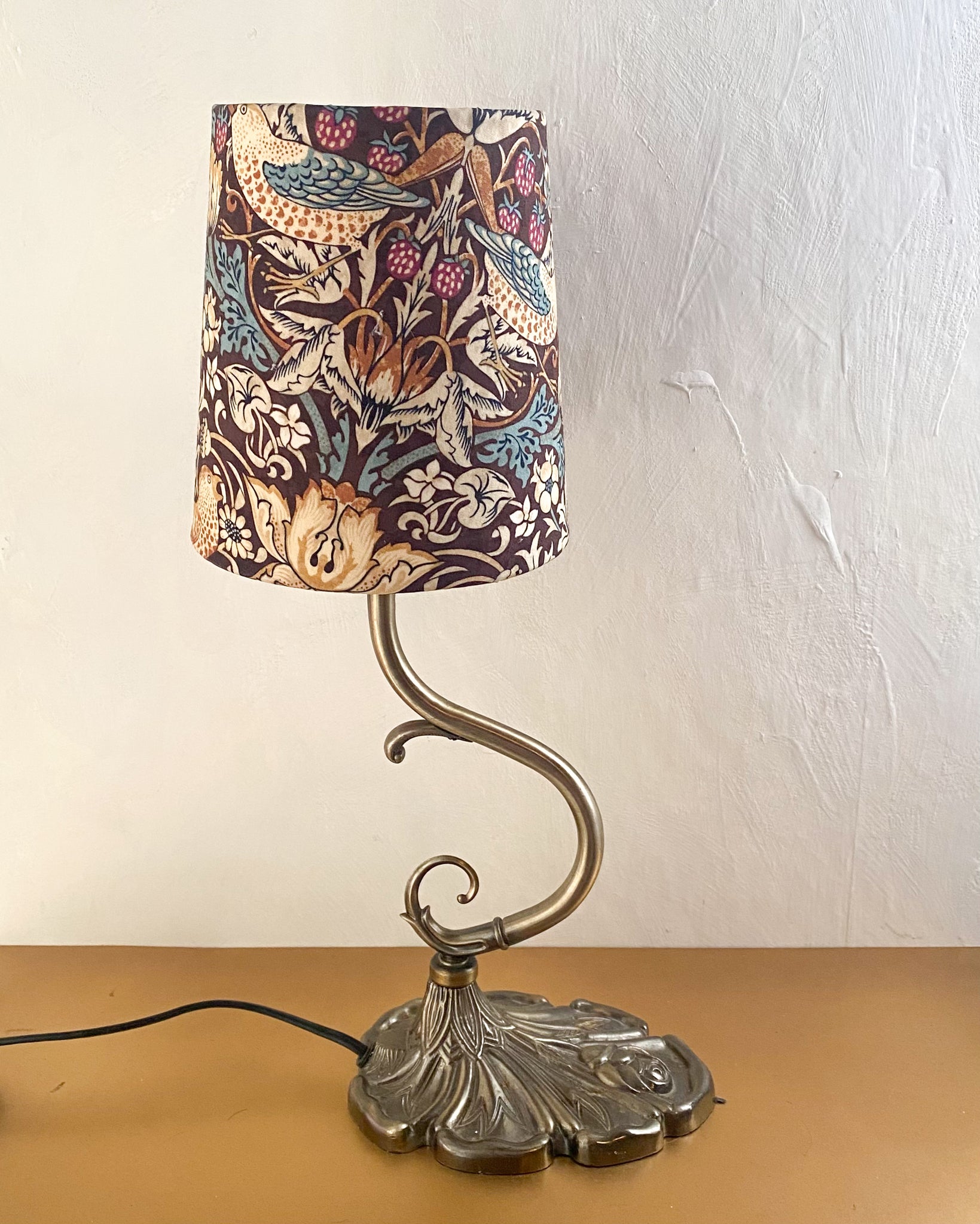 En lampskärm från second hand, omklädd i vackert tyg; William Morris ”strawberry thief”.