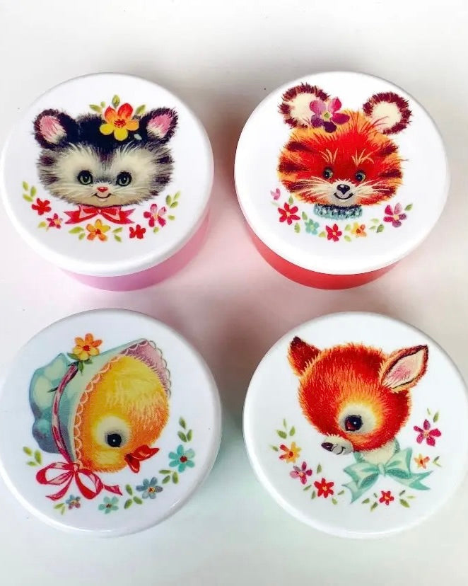 Den lilla burken har ett lock med ett bedårande tryck i retro-stil.