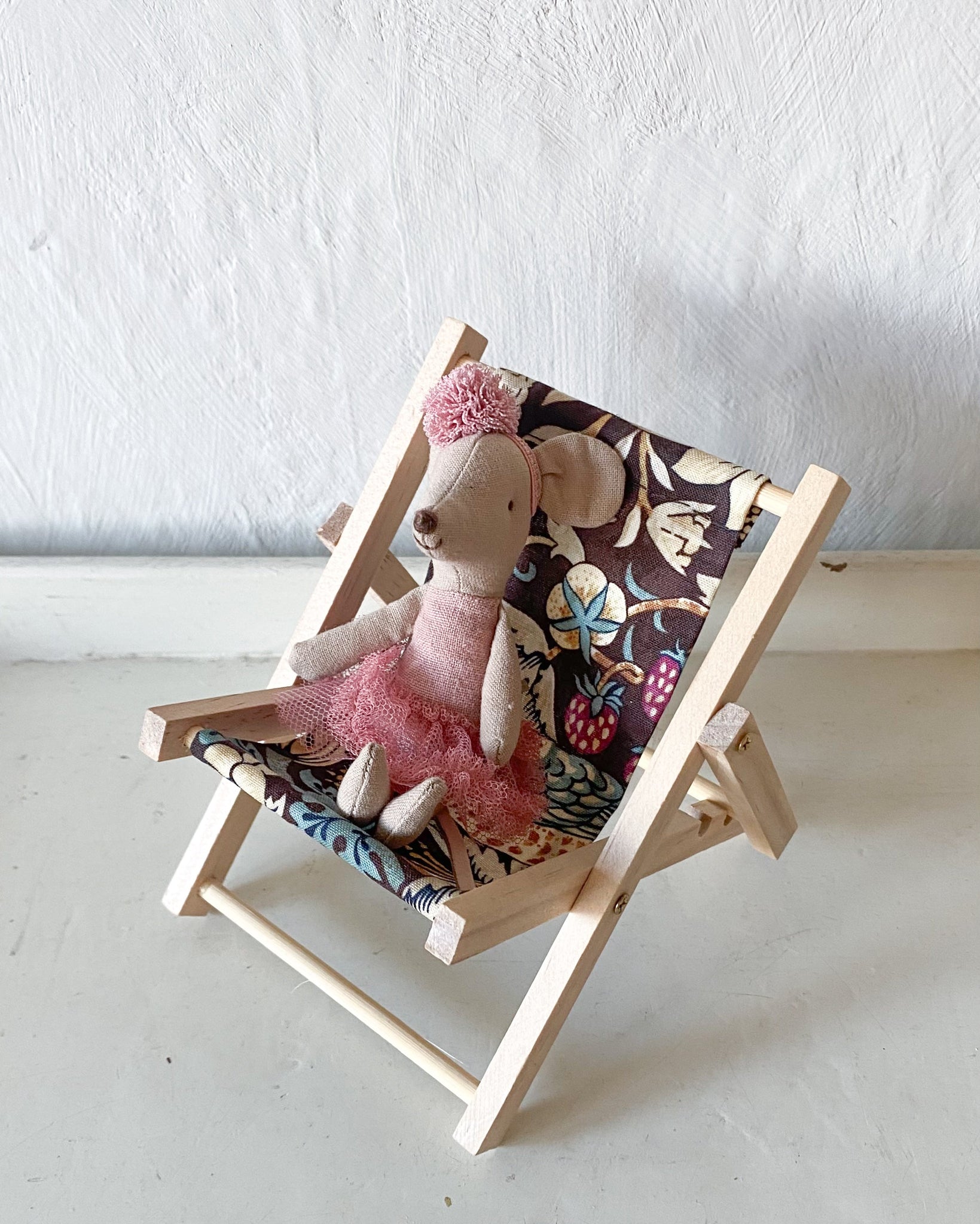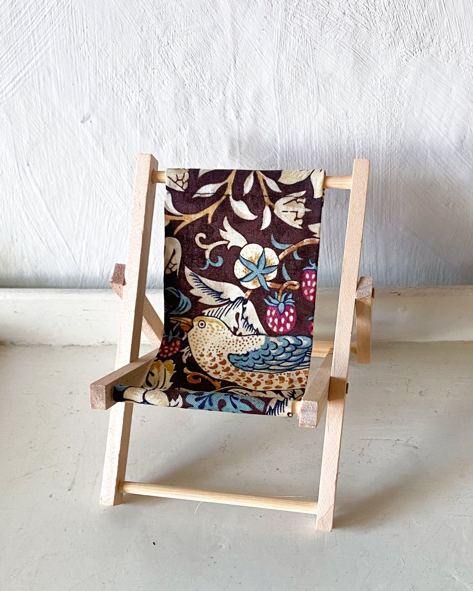 Solstol av trä med tyg i William Morris-mönster.
