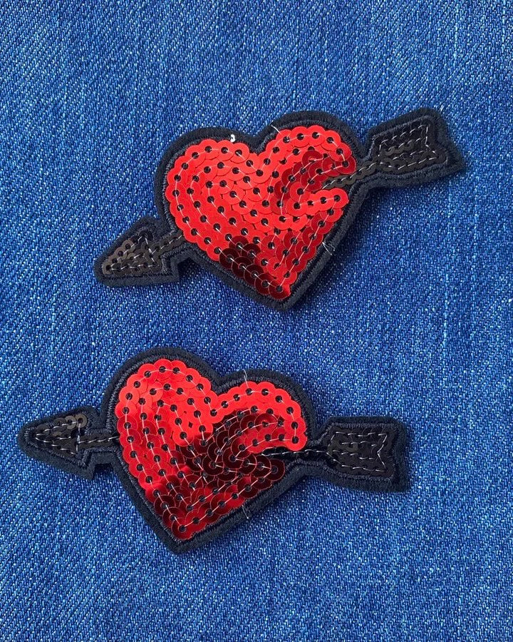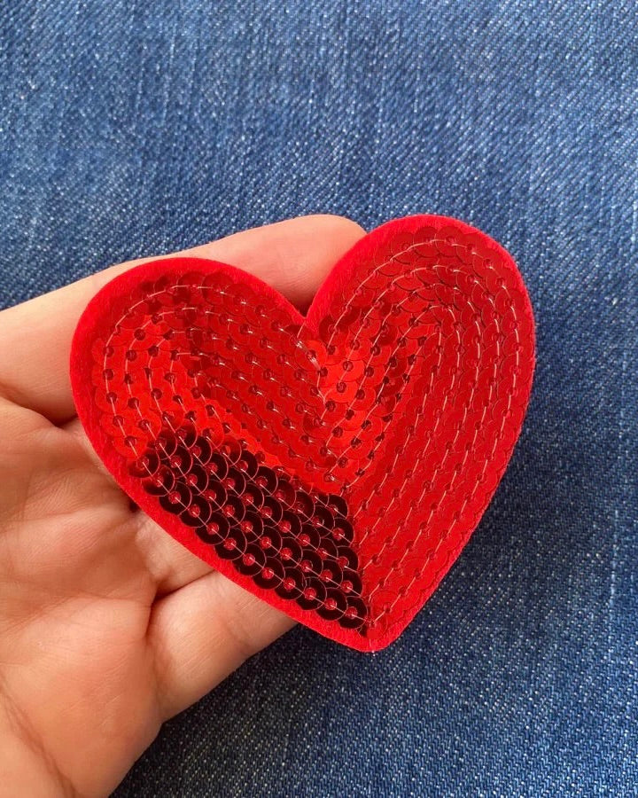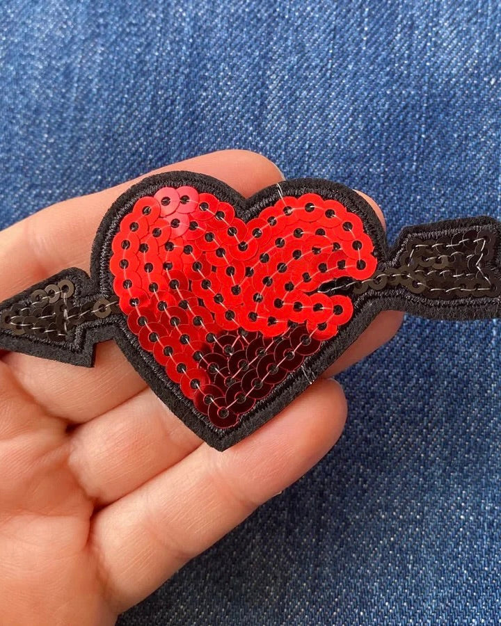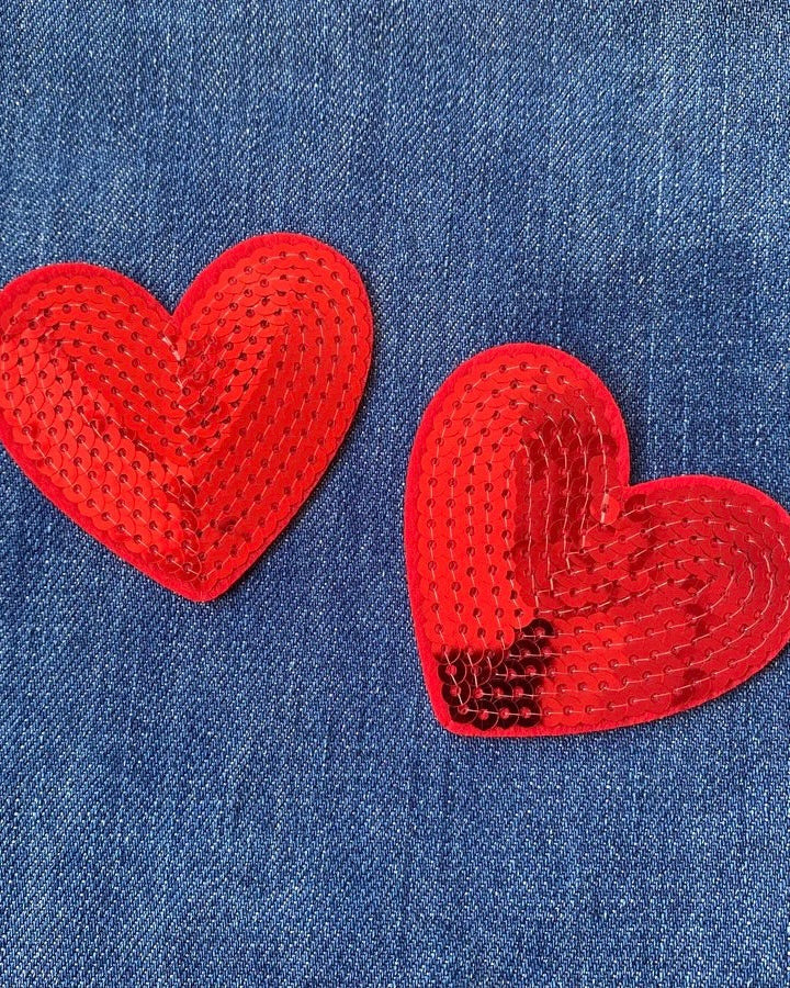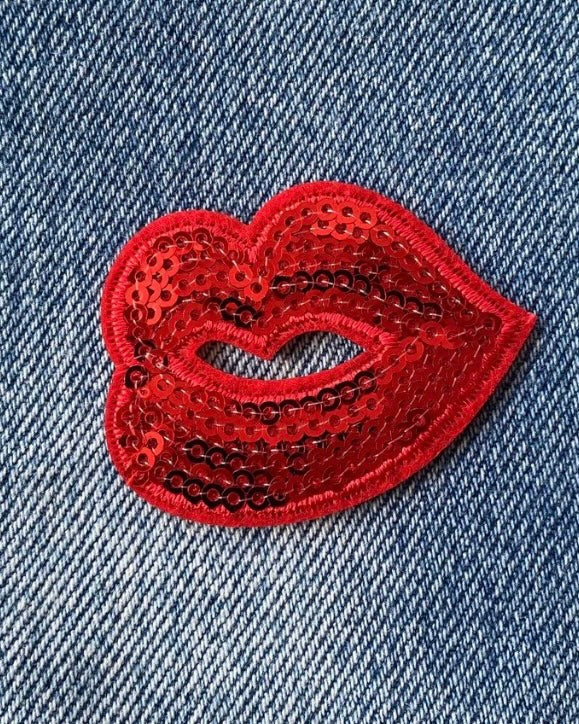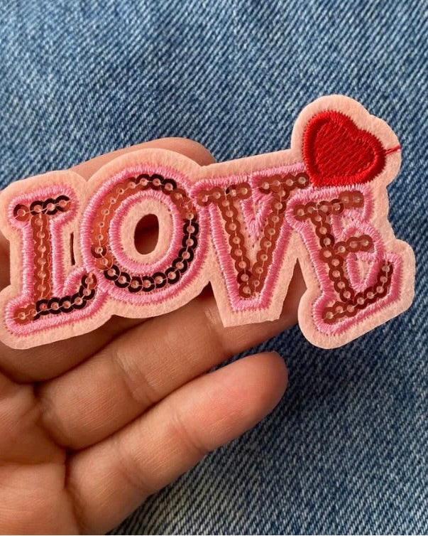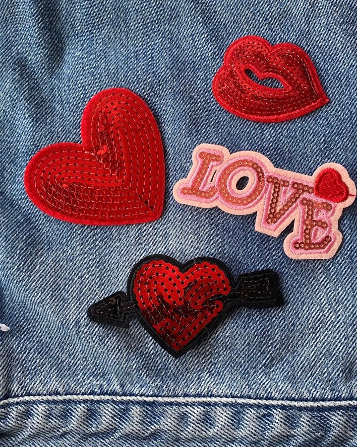 "iron-on", stryk på-lappar i form av en hjärtan, pussmun och ”love”. Köp en och en eller hela setet.