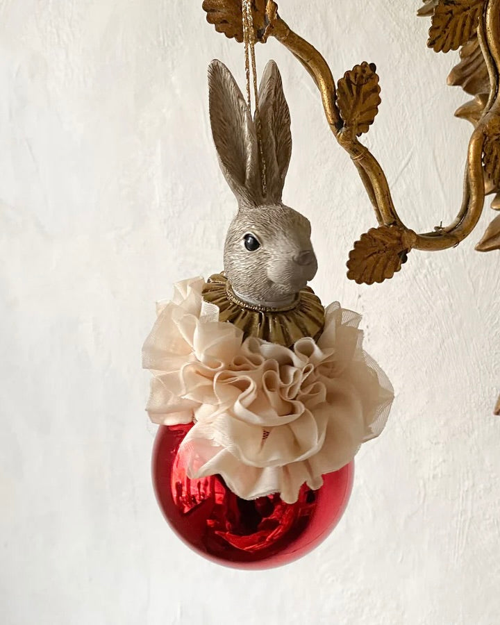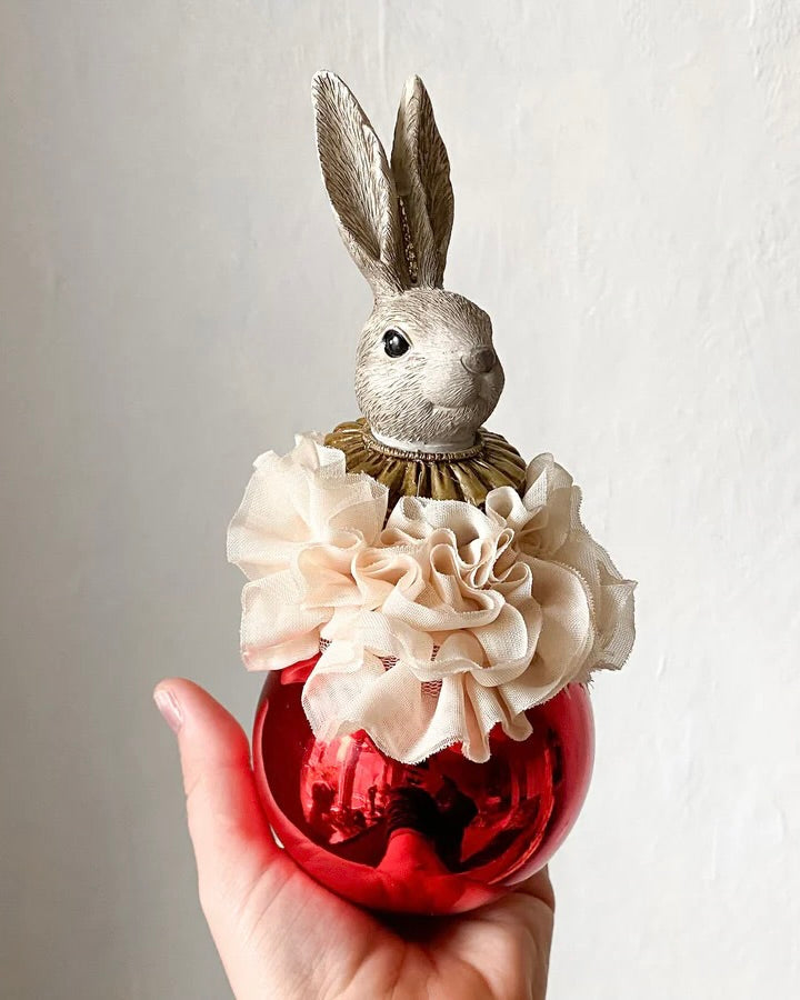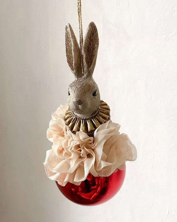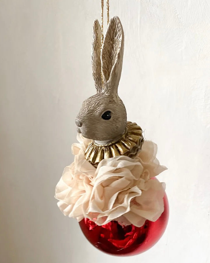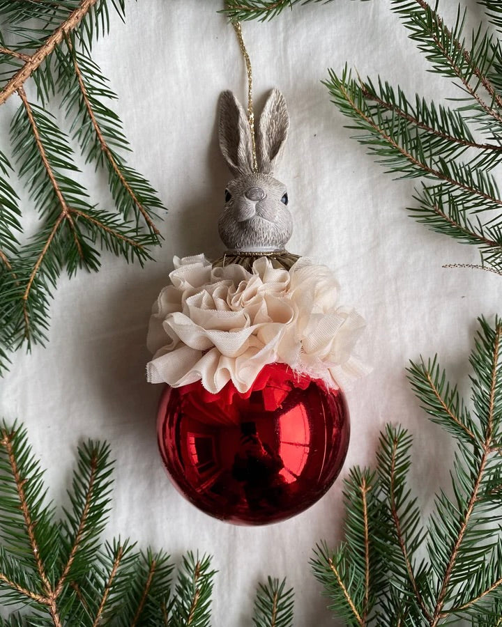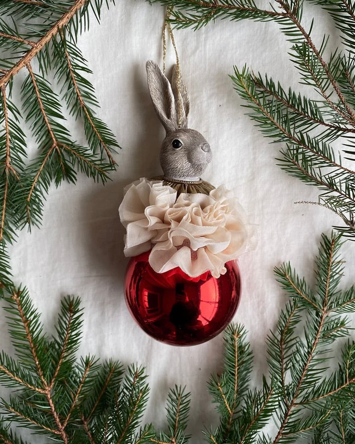 Sagolik juldekoration i form av en kanin-julkula med fluffig krage.
