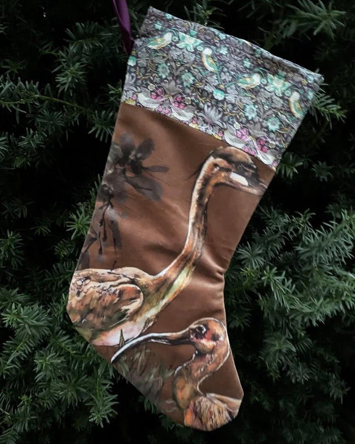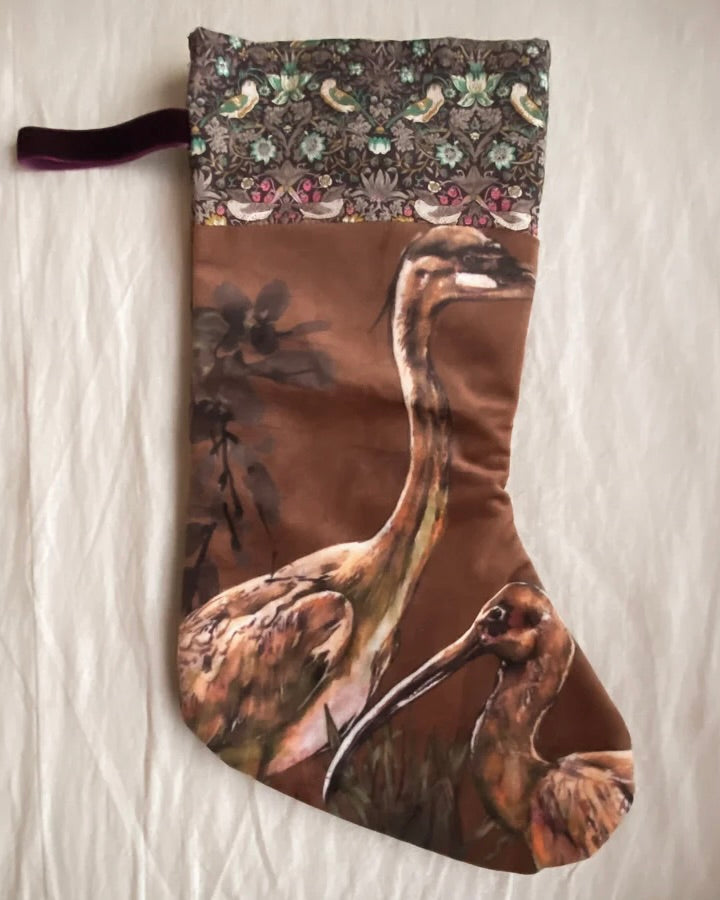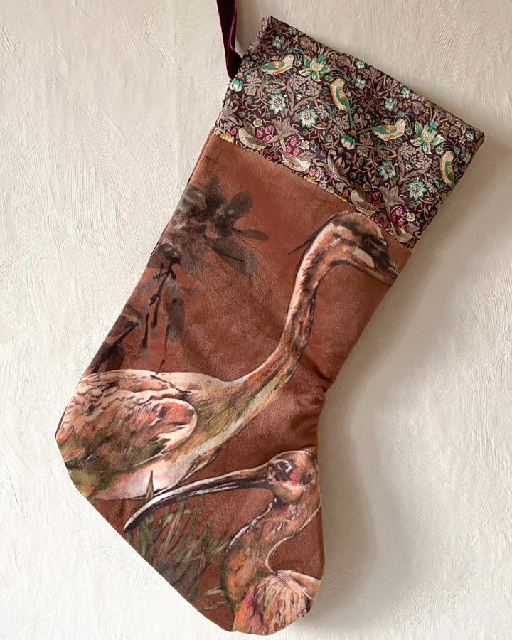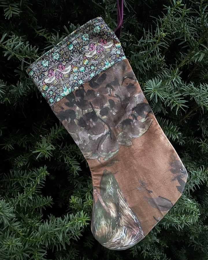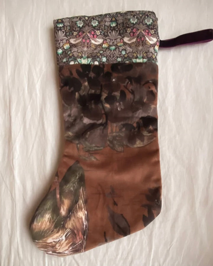Den har ett stärkande jutetyg inuti och en hängare av sammetsband.