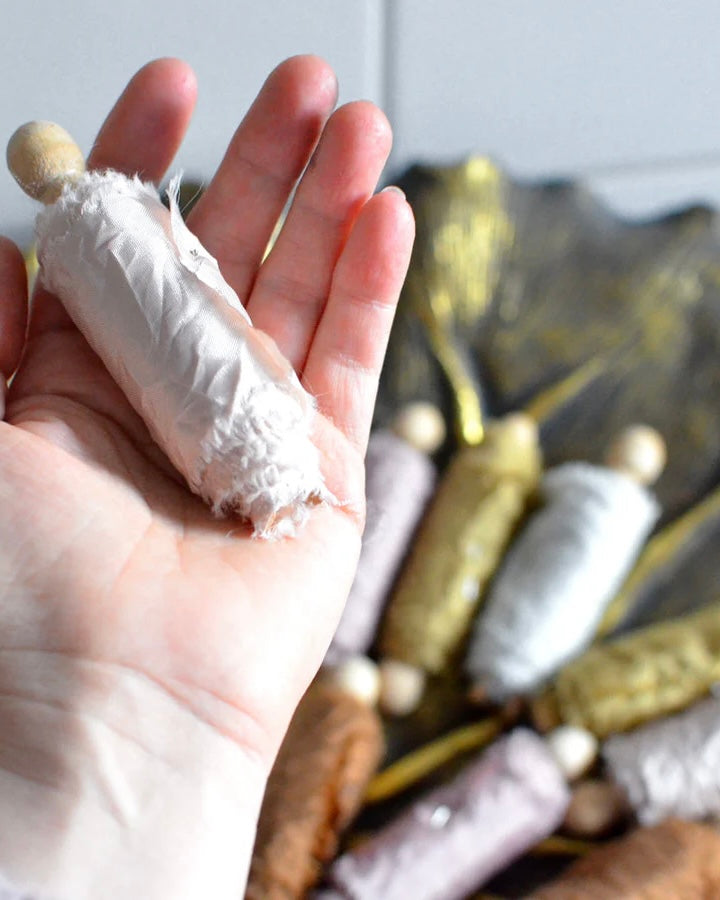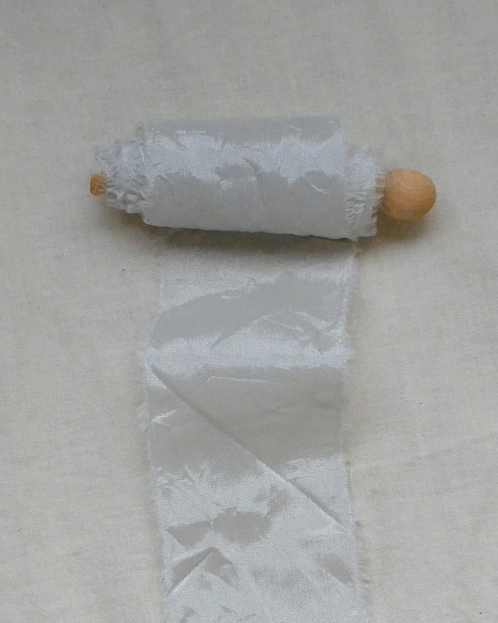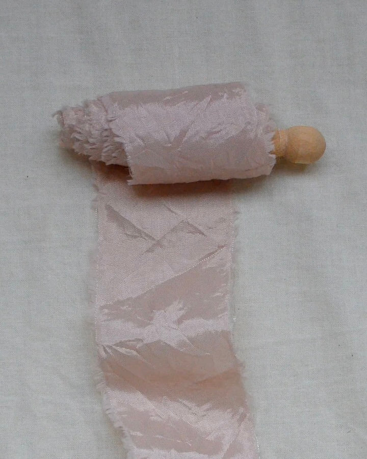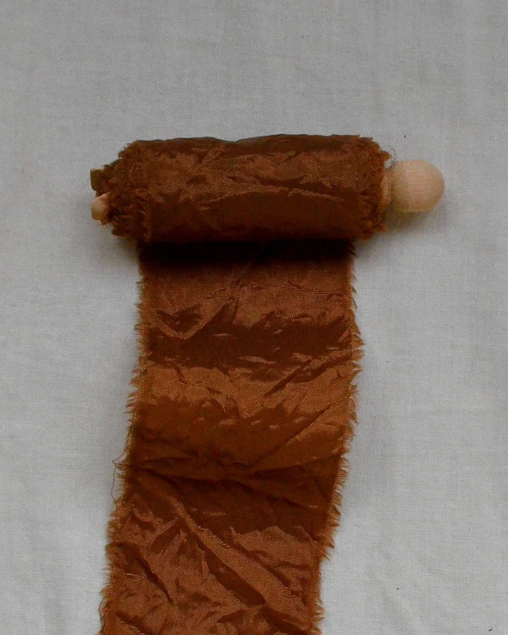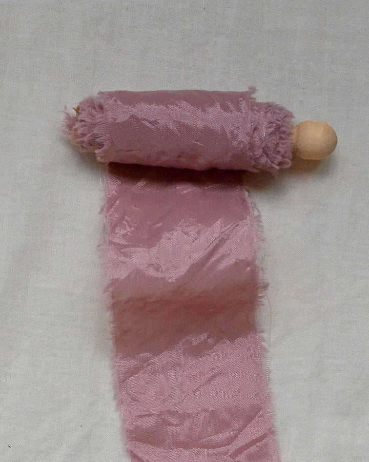 Band av acetattyg med råa kanter, rullat på en gammaldags klädnypa av trä.