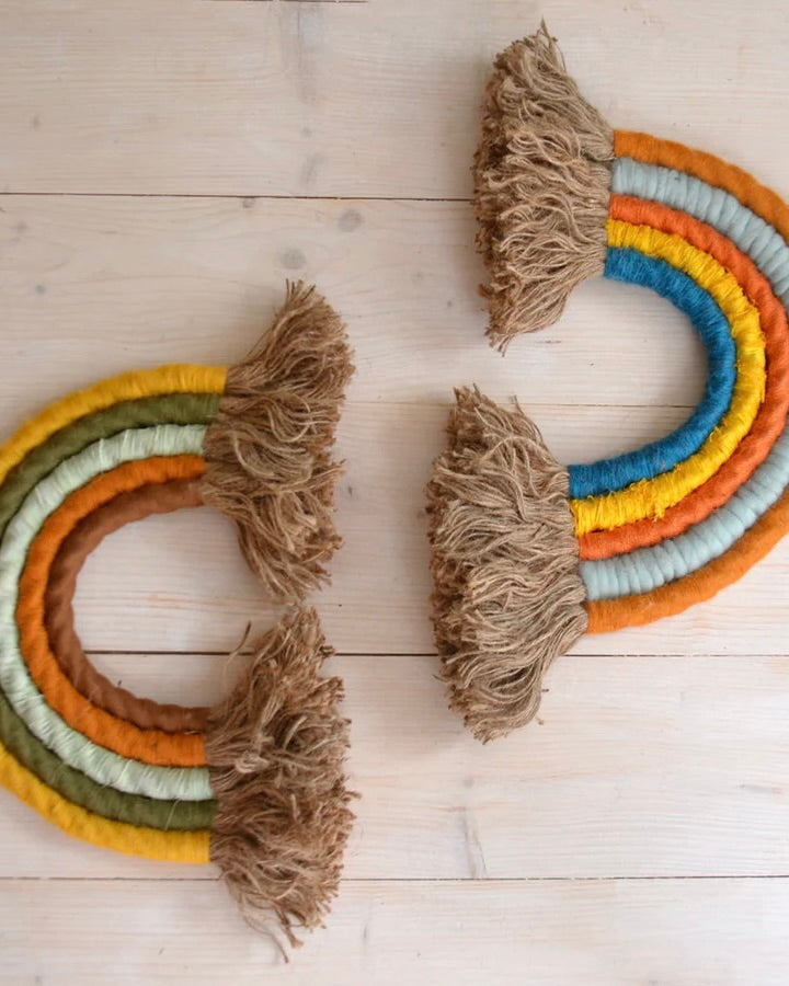 Väggprydnad i form av regnbåge, handgjord av juterep omlindat med sidentyg och olika typer och varianter av garn. Mycket av garnet återvinns, från secondhandbutiker och loppisar. Sidentyget är från återanvända saris, handfärgade med naturliga pigment.