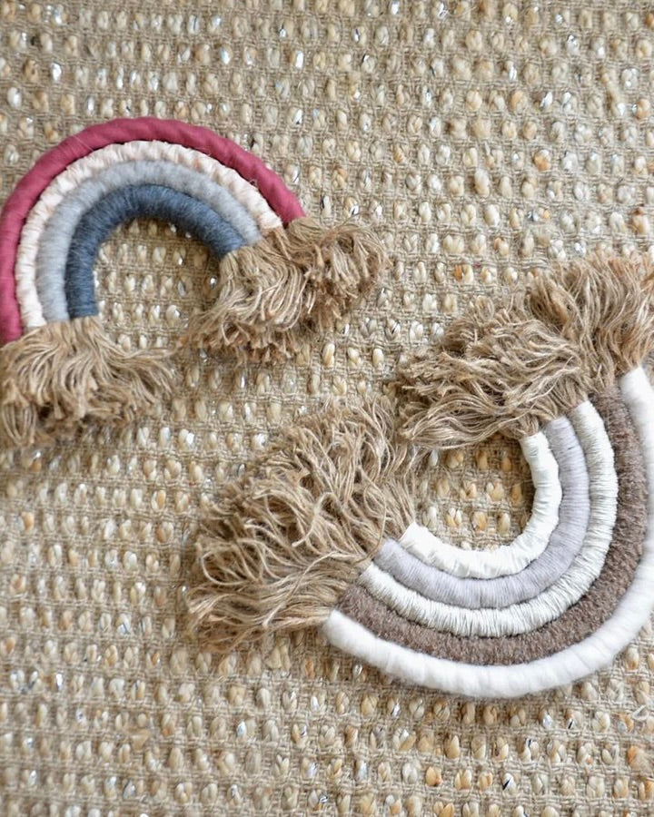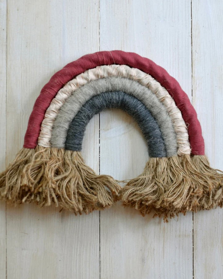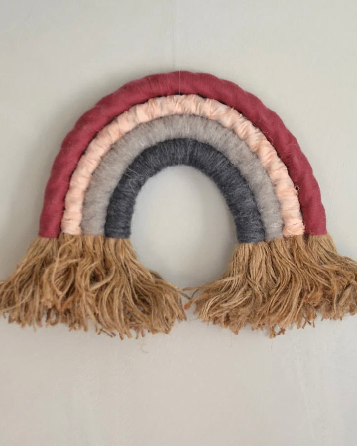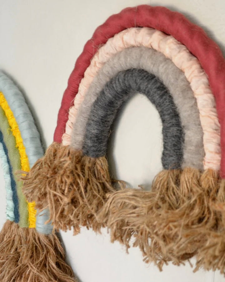 Väggprydnad i form av regnbåge, handgjord av juterep omlindat med sidentyg och olika typer och varianter av garn. Mycket av garnet återvinns, från secondhandbutiker och loppisar. Sidentyget är från återanvända saris, handfärgade med naturliga pigment.