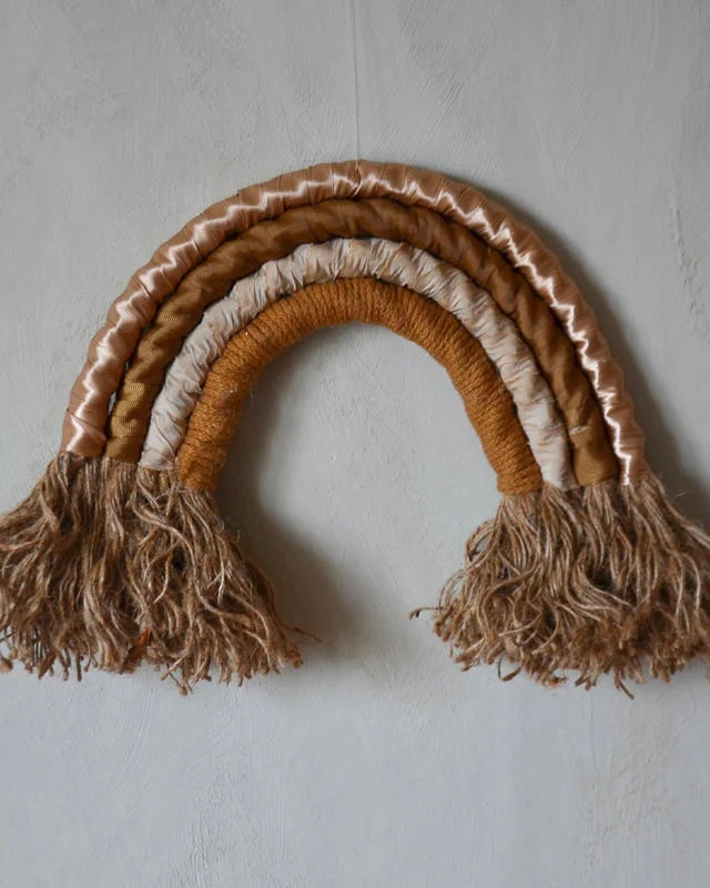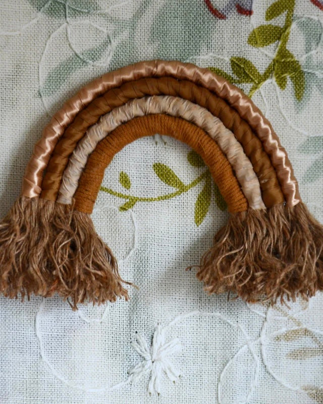 Väggprydnad i form av regnbåge, handgjord av juterep omlindat med och olika typer av garn och band. Mycket av garnet är återvunnet, från secondhandbutiker och loppisar.