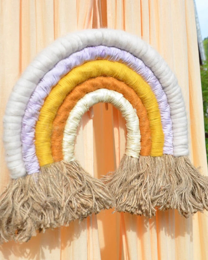 Väggprydnad i form av regnbåge, handgjord av juterep omlindat med sidentyg och olika typer och varianter av garn. Mycket av garnet är återvunnet, från secondhandbutiker och loppisar. Sidentyget är från återanvända saris, handfärgade med naturliga pigment.