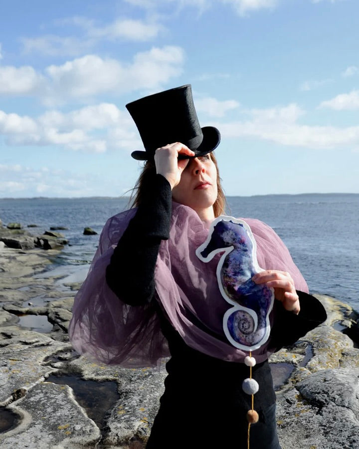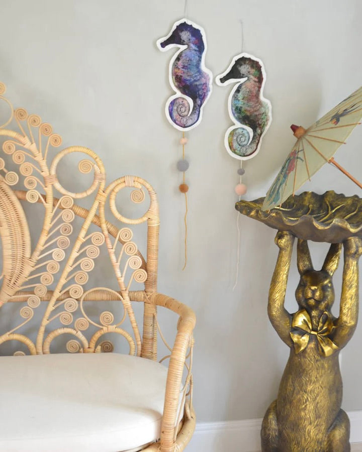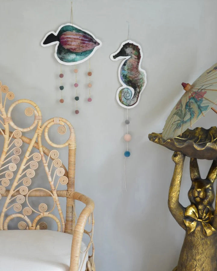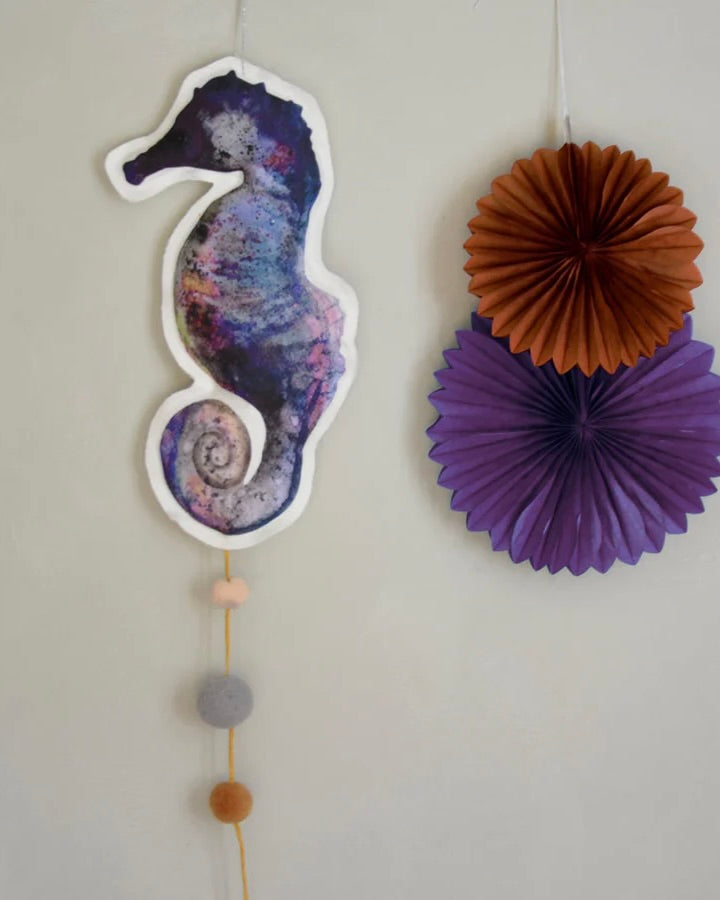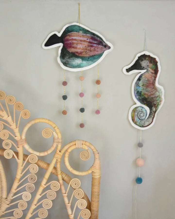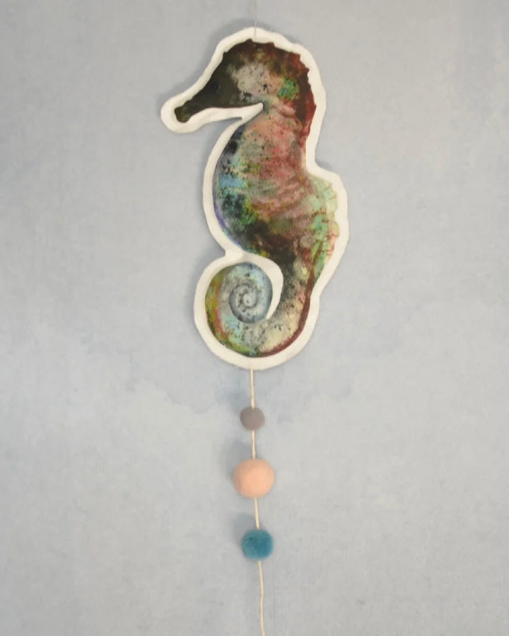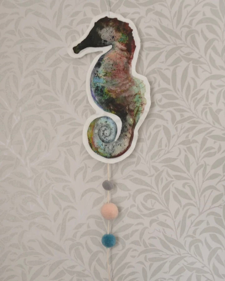 Sjöhästmobil, handgjord av linneblandat tyg
