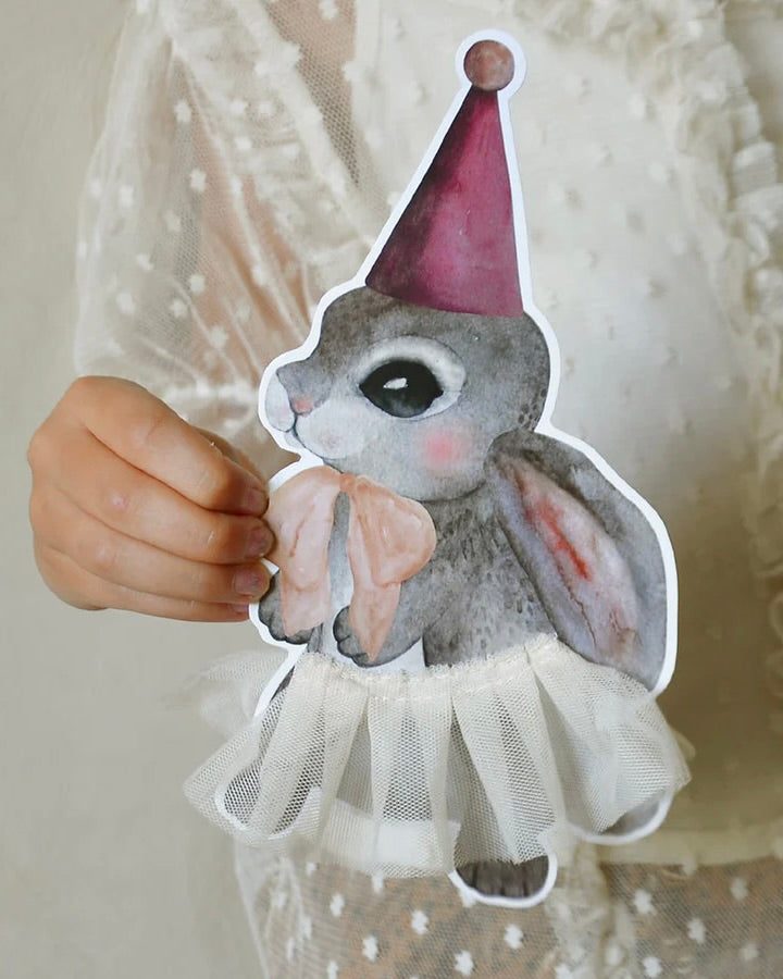 Denna partykanin är tillverkad av hårt papper med en handsydd tutu-kjol.