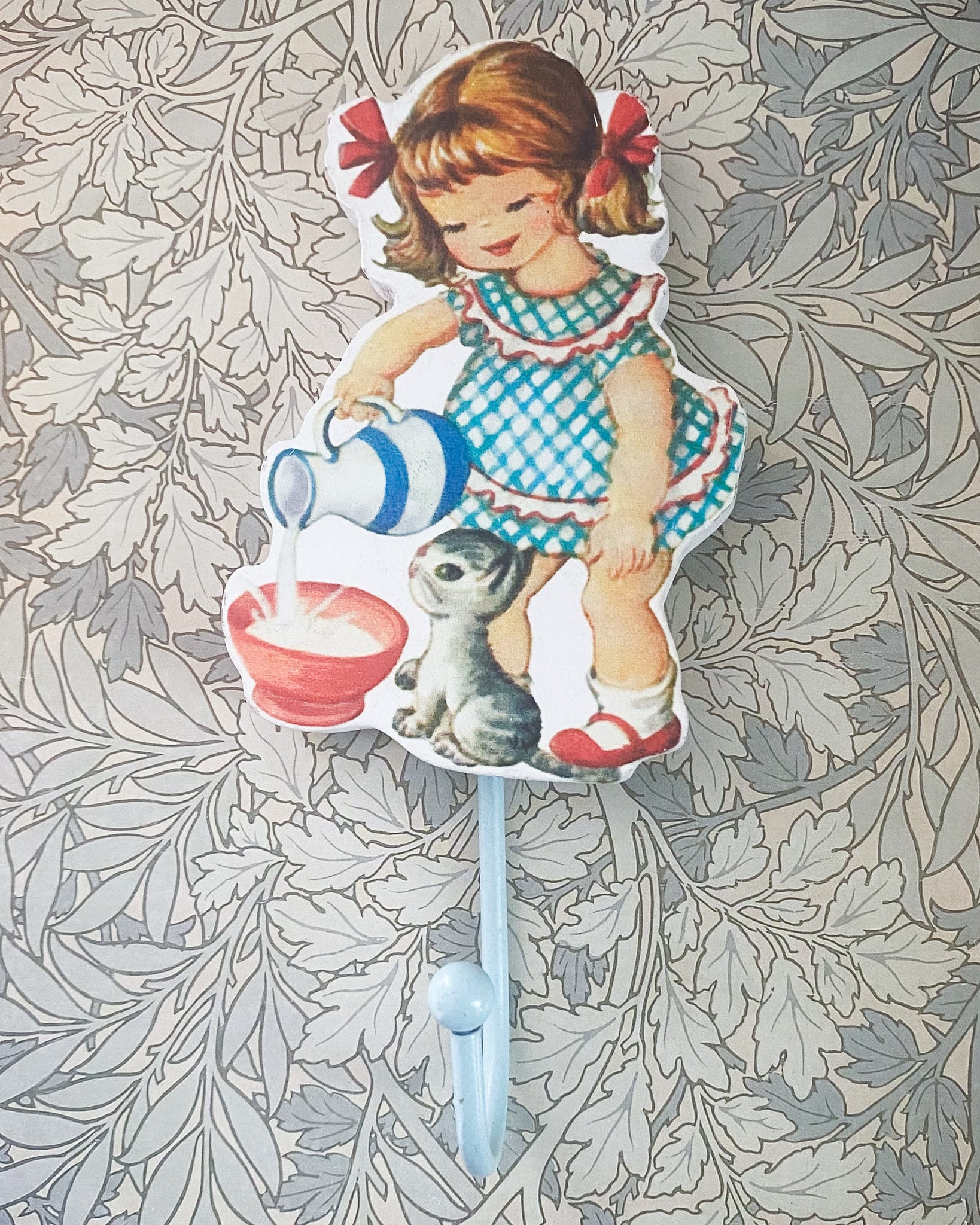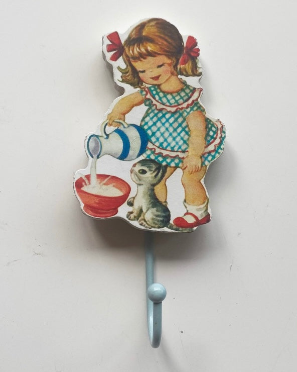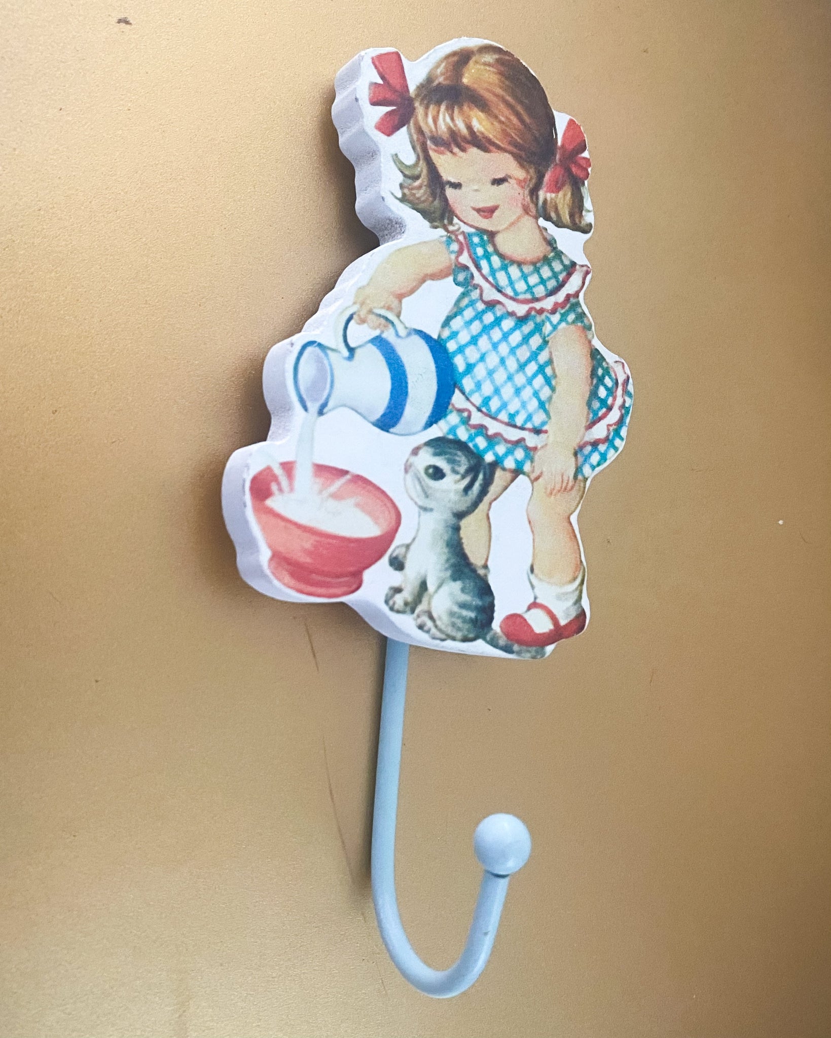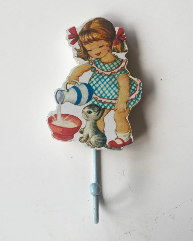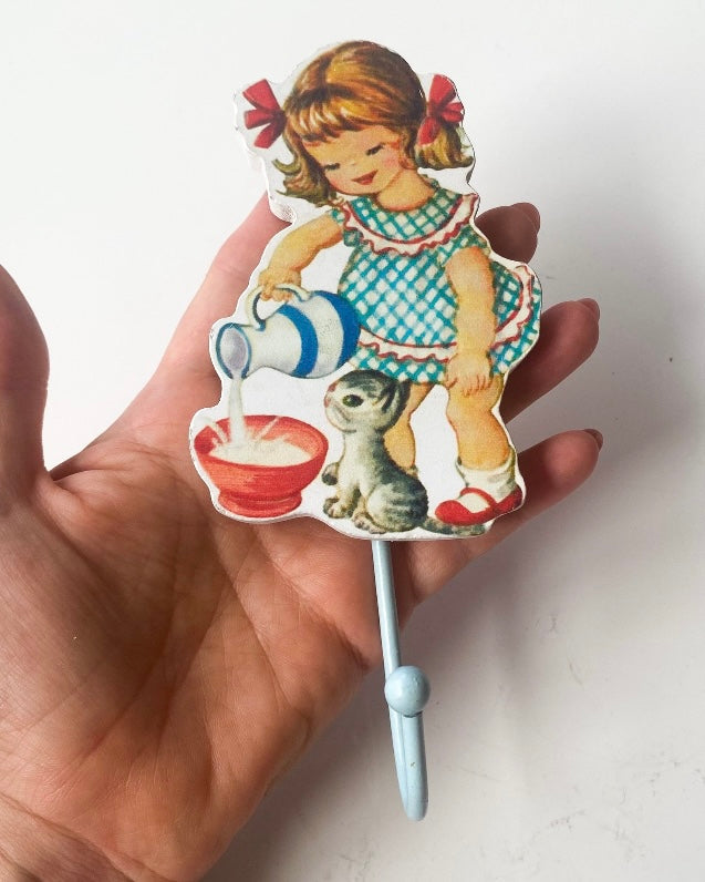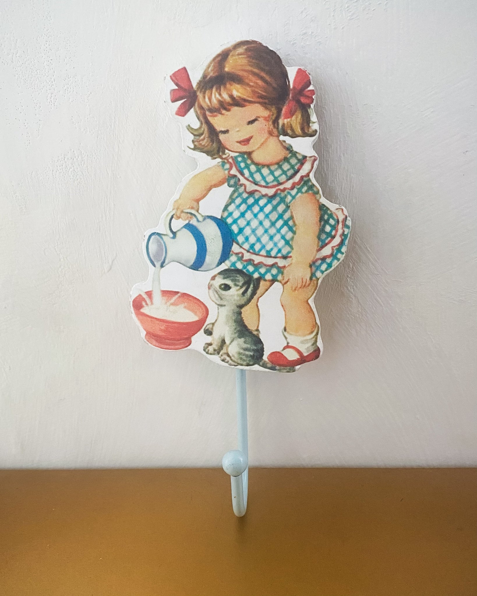 Charmig krok med motiv av en flicka som häller mjölk till en katt.