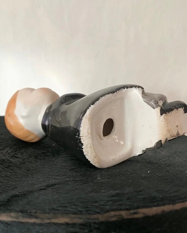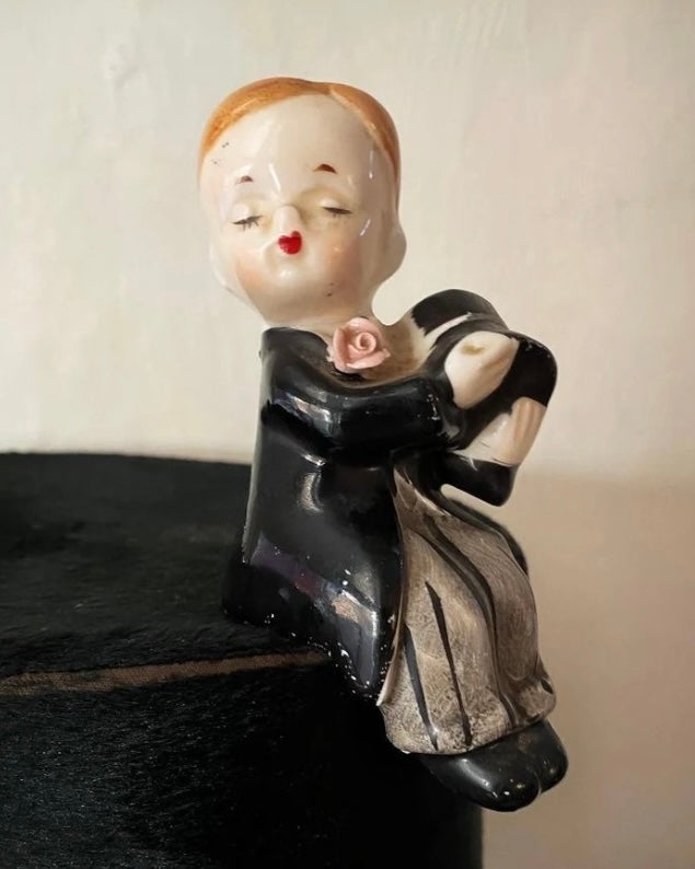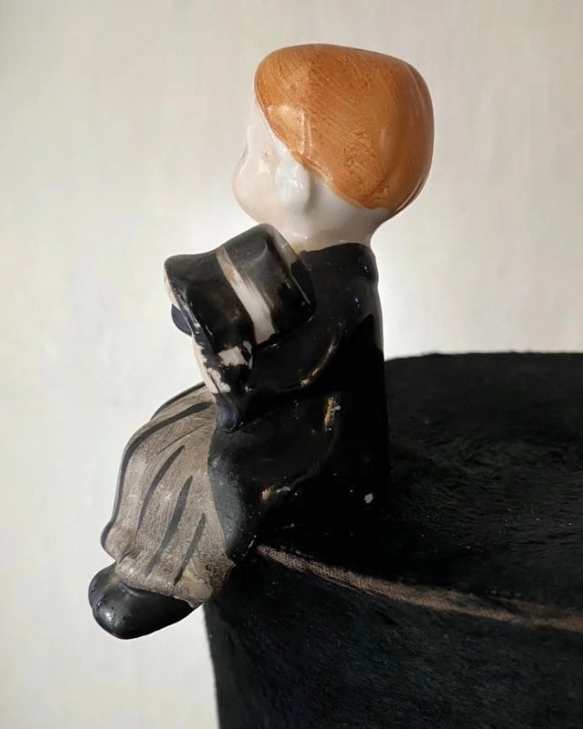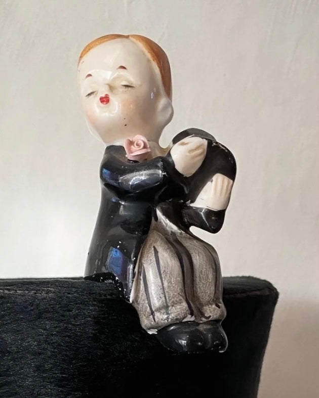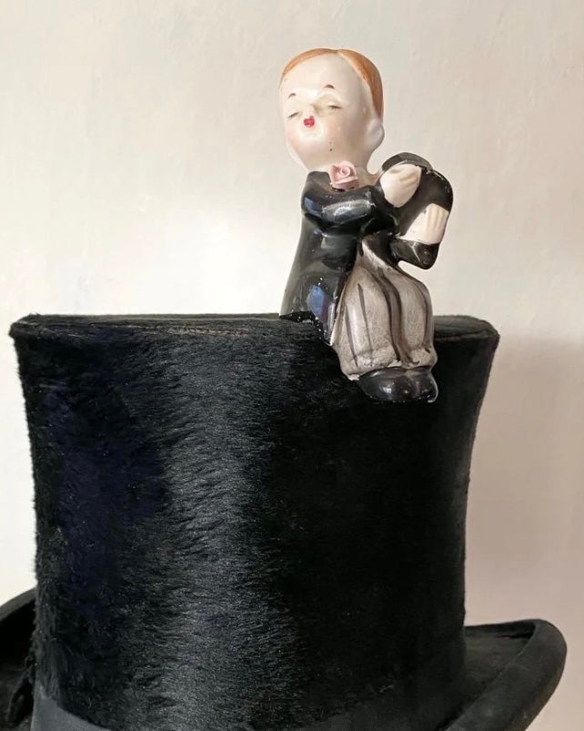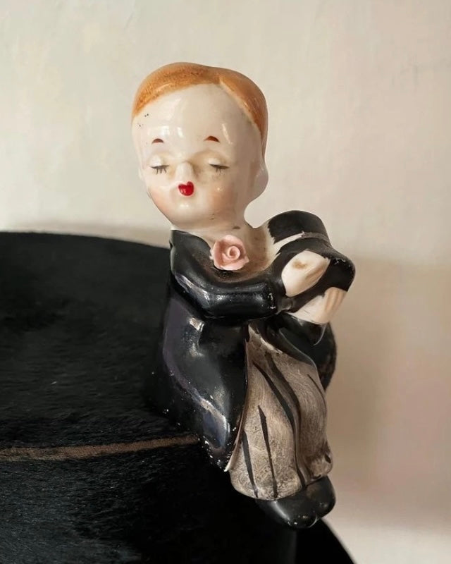 Söt liten porslinsfigur i form av en pojke (eller brudgum) i festliga kläder och hög hatt.