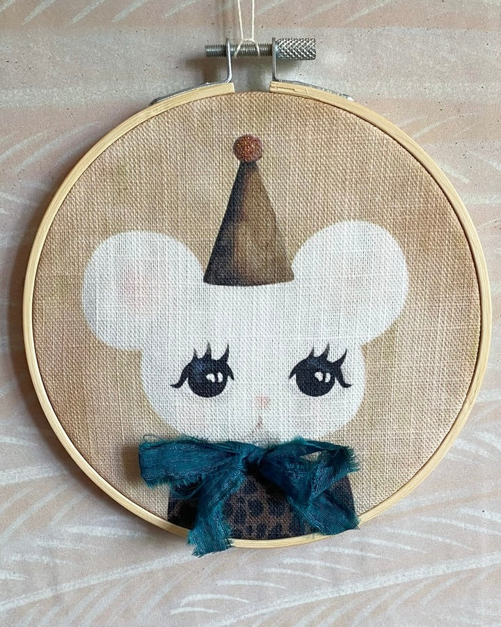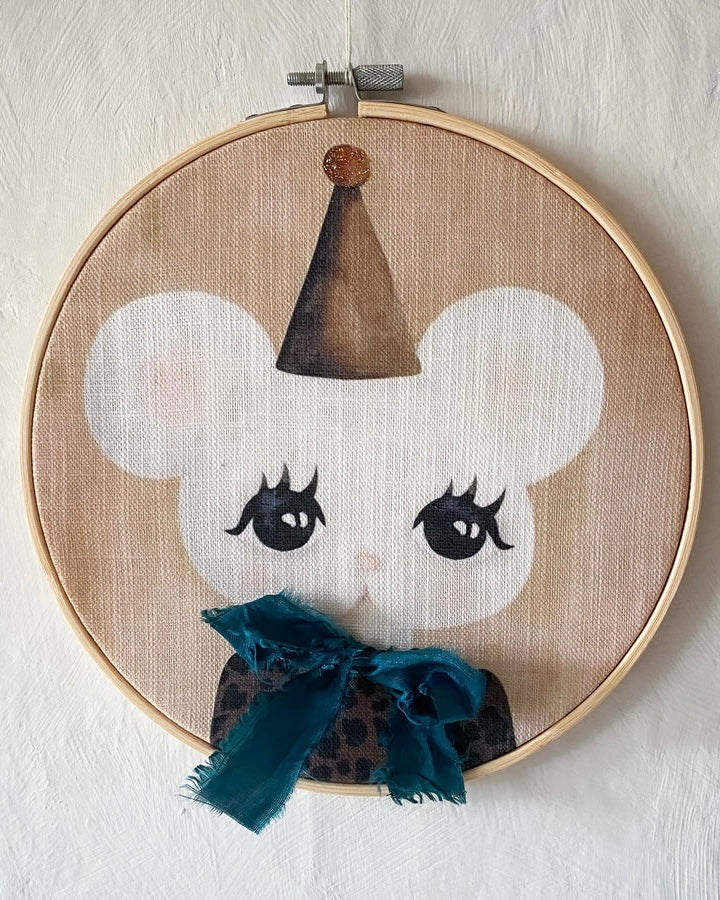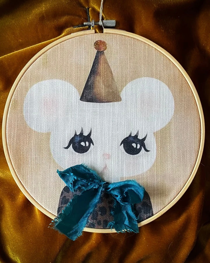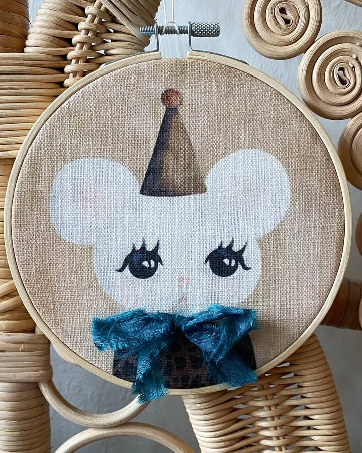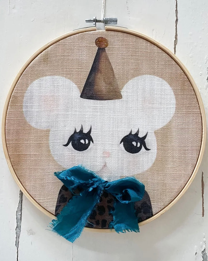 Saffron har detaljer som en rosett av acetat-tyg runt halsen och glitter på toppen av sin partyhatt. Handgjord av Dessin Design.
