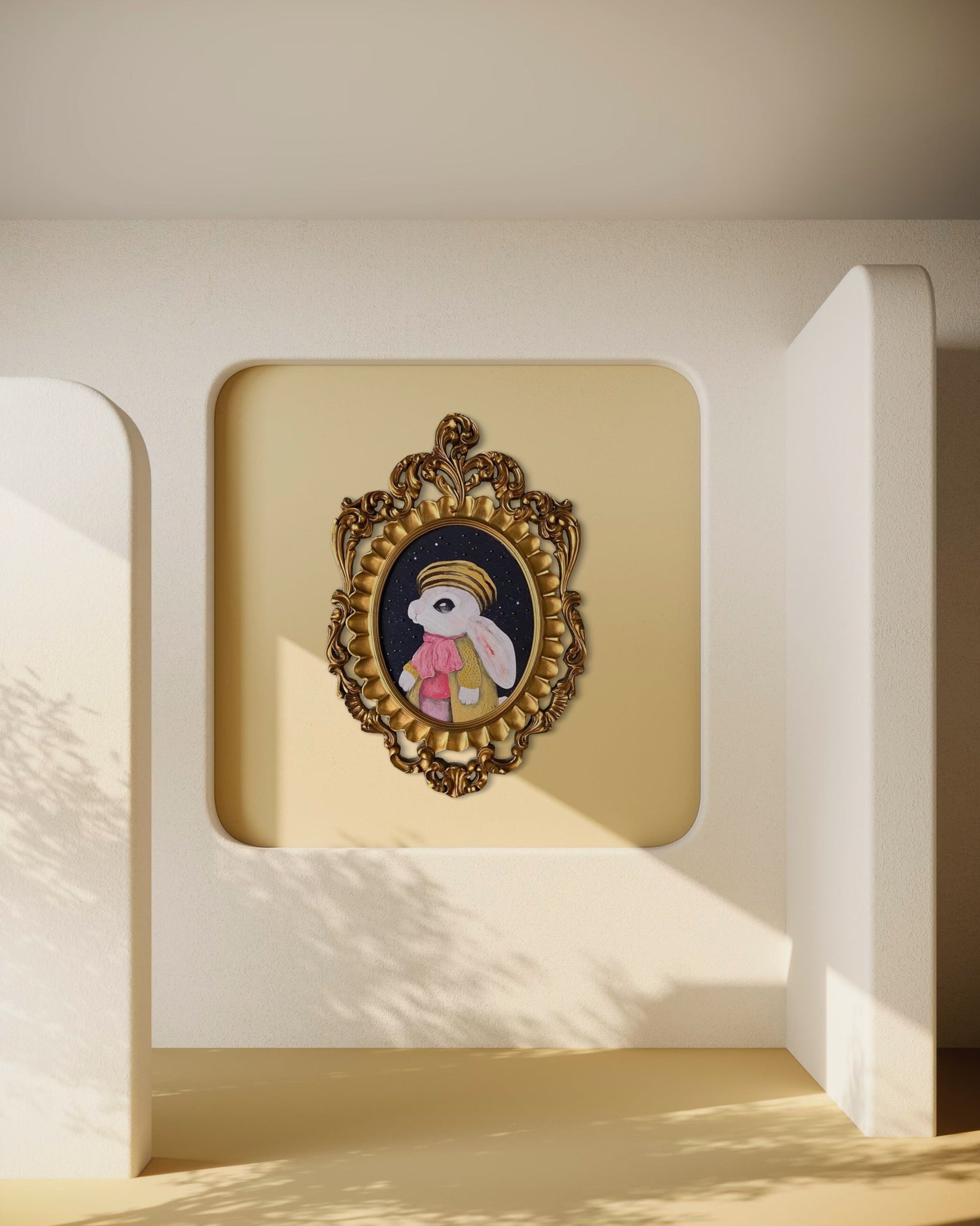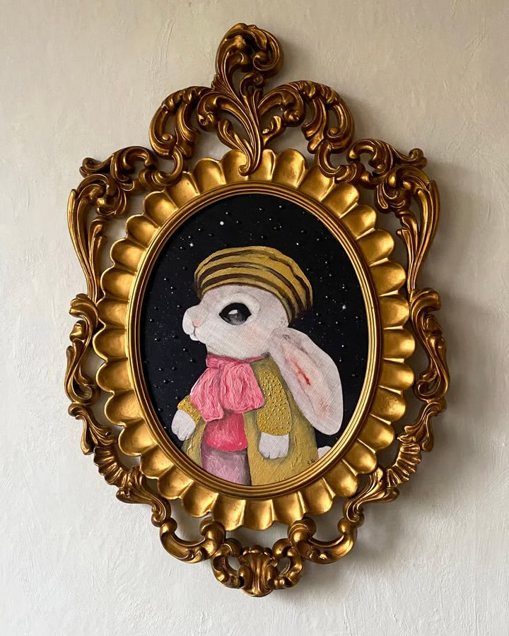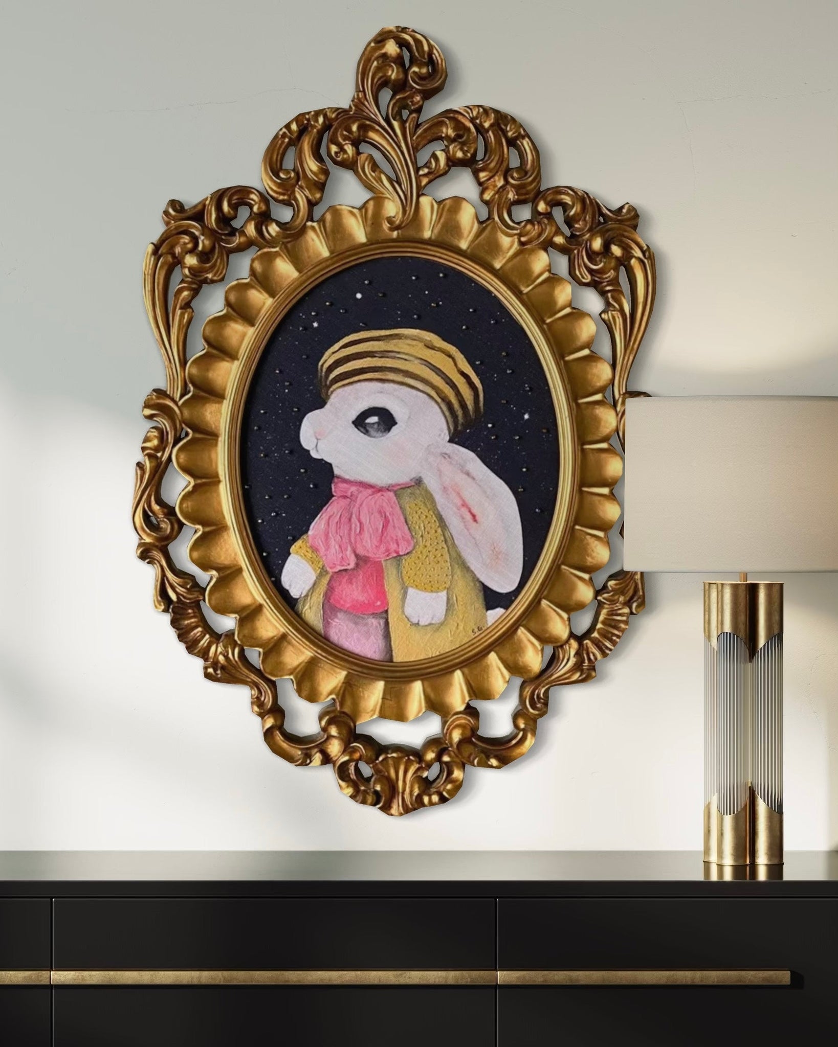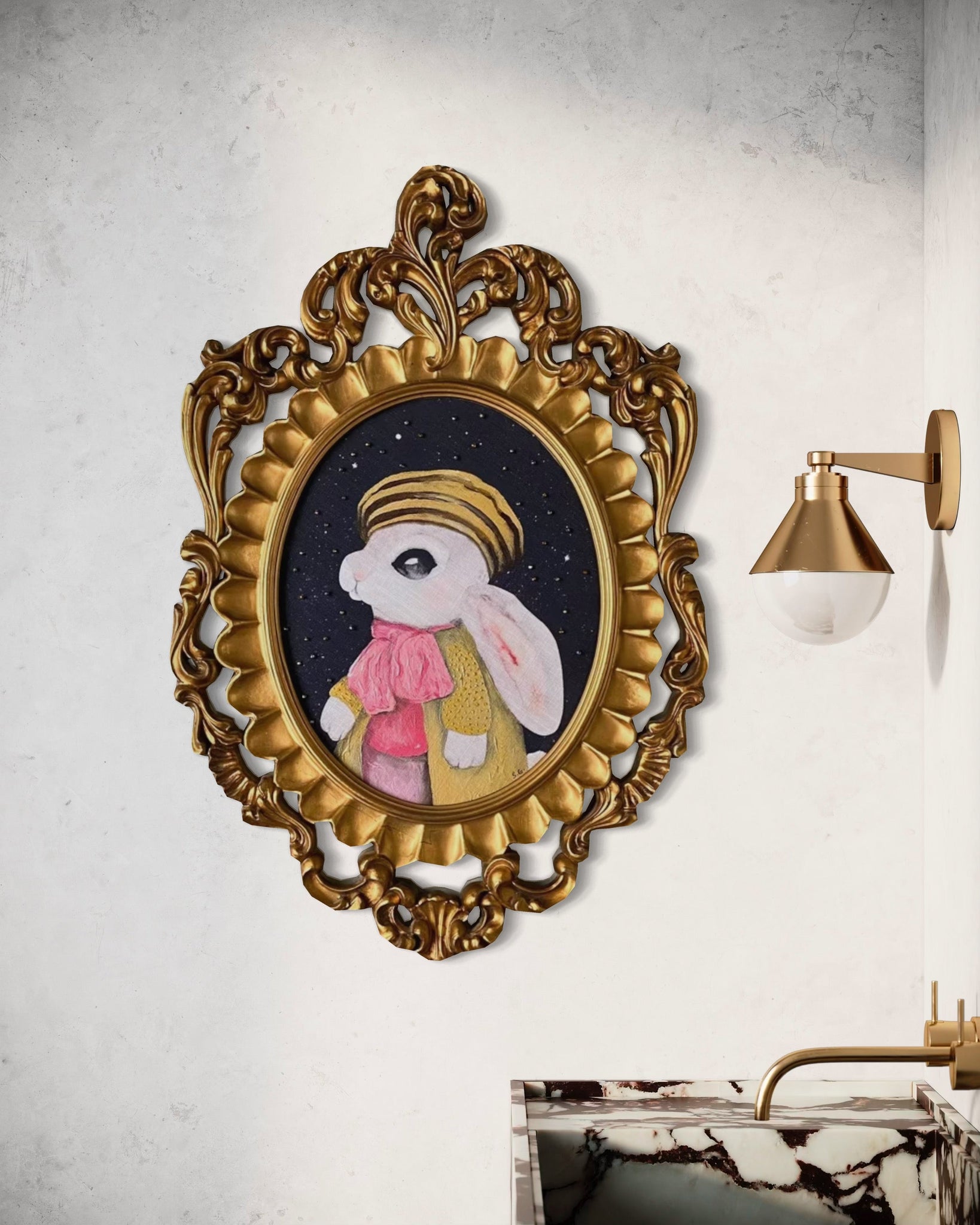 The little rabbit has dressed up in its finest coat with a matching beret to take a walk under the sparkling stars.