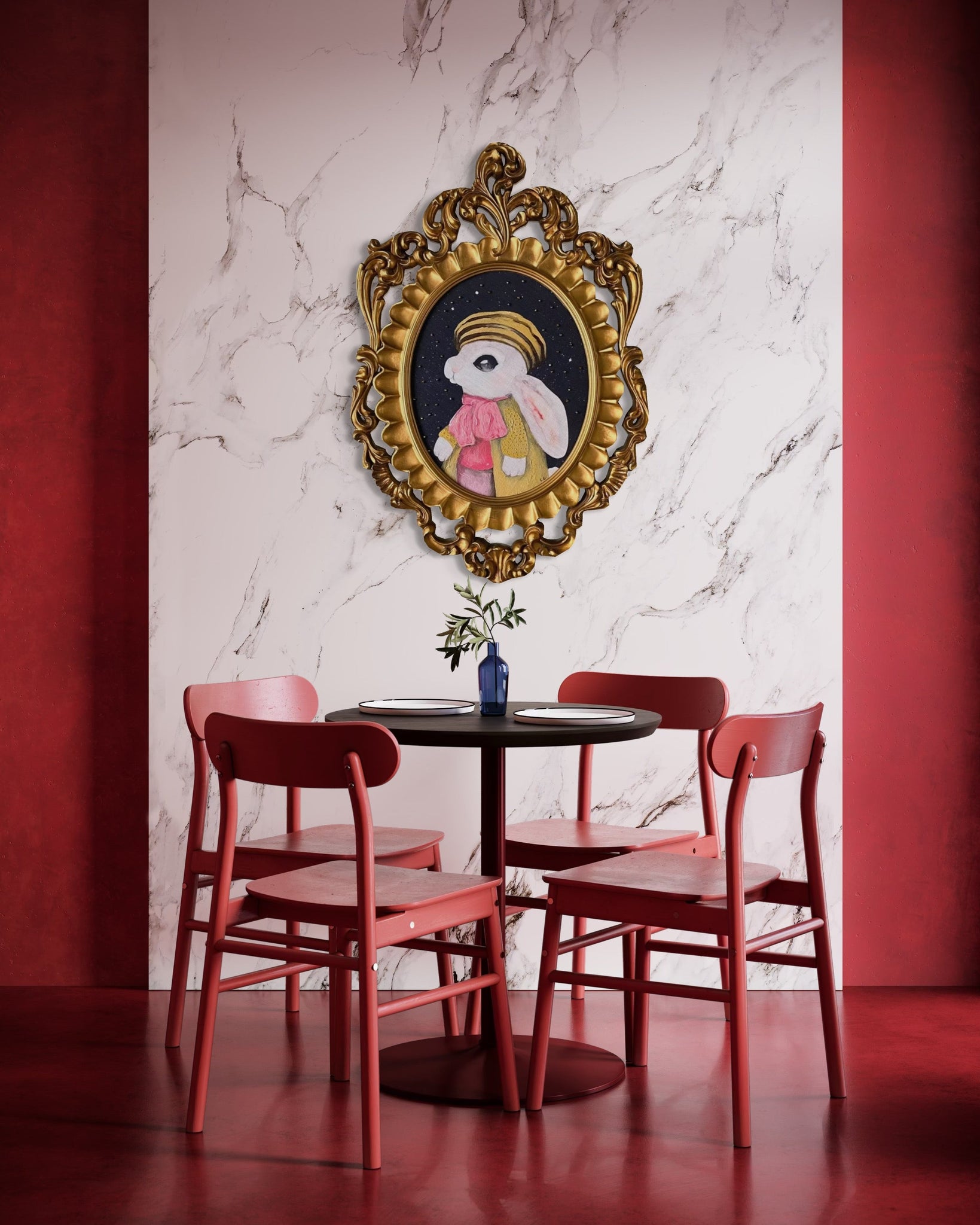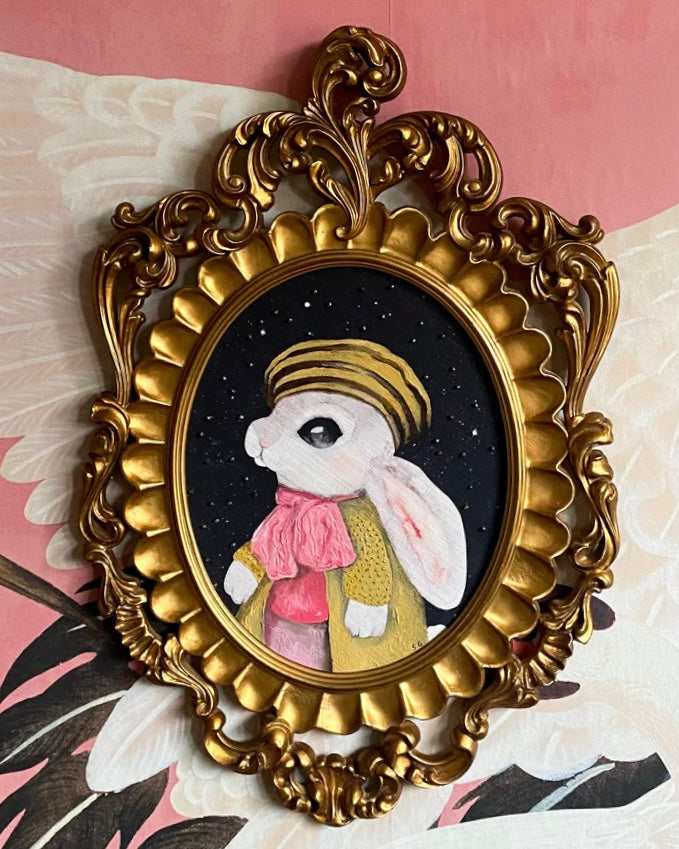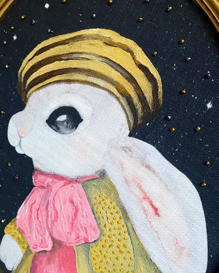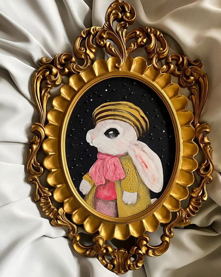 The little rabbit has dressed up in its finest coat with a matching beret to take a walk under the sparkling stars.