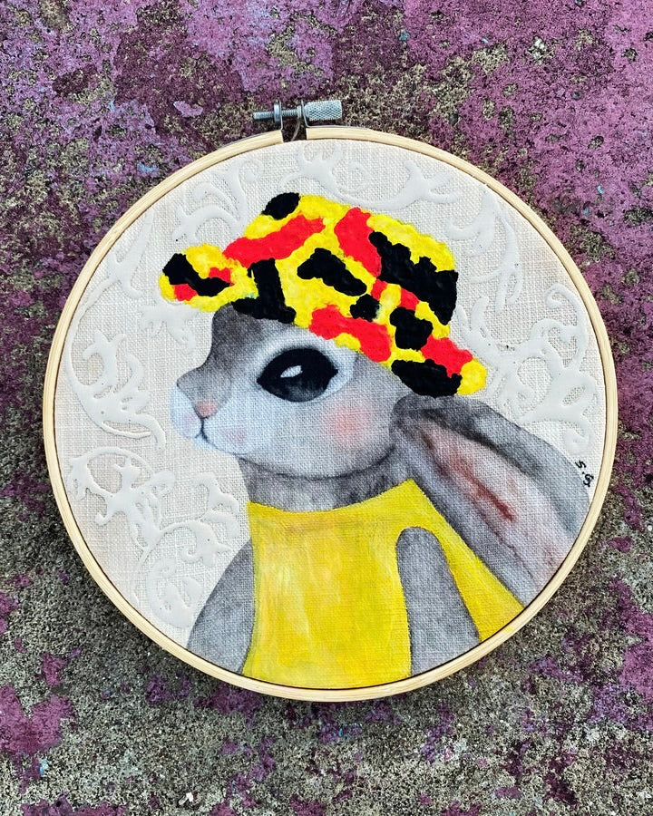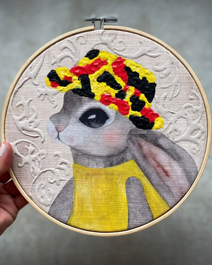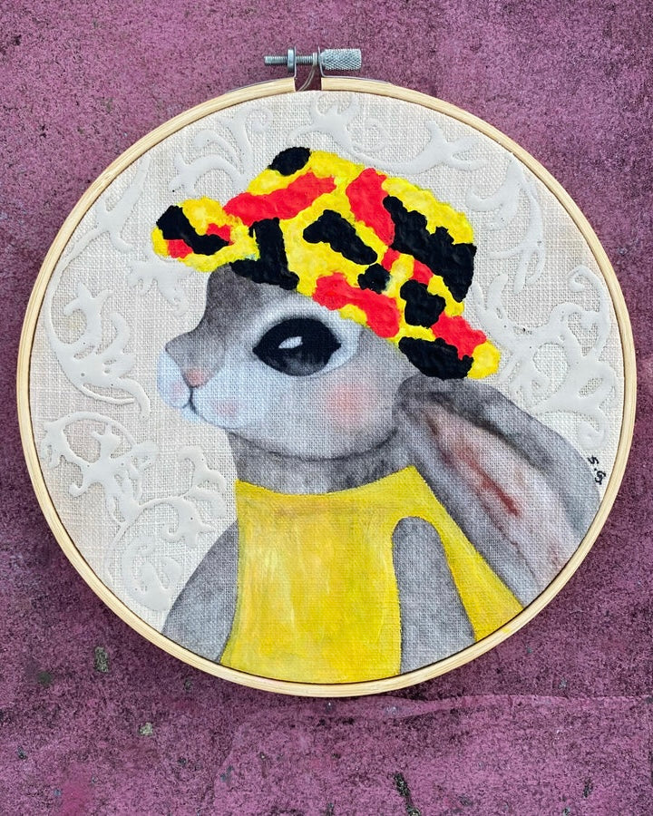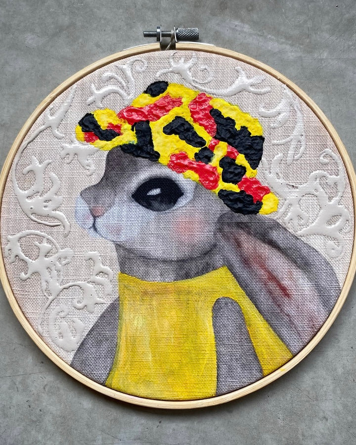 Unique artwork with hand painted details on printed linen mixed canvas fabric,