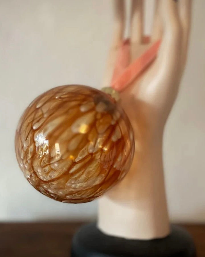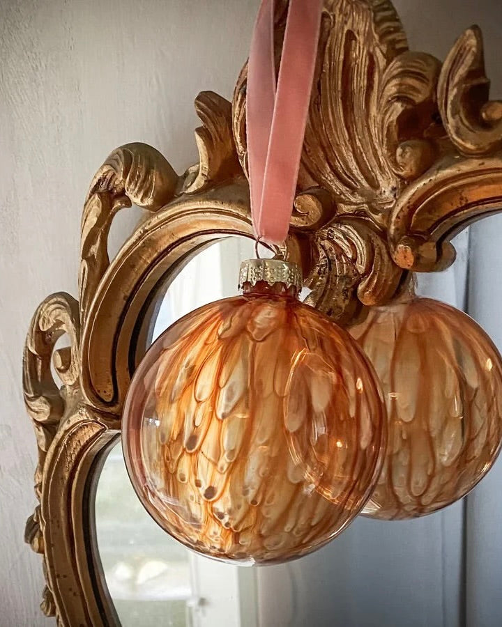Beautiful, delicate glass ornament hanging from a velvet ribbon.