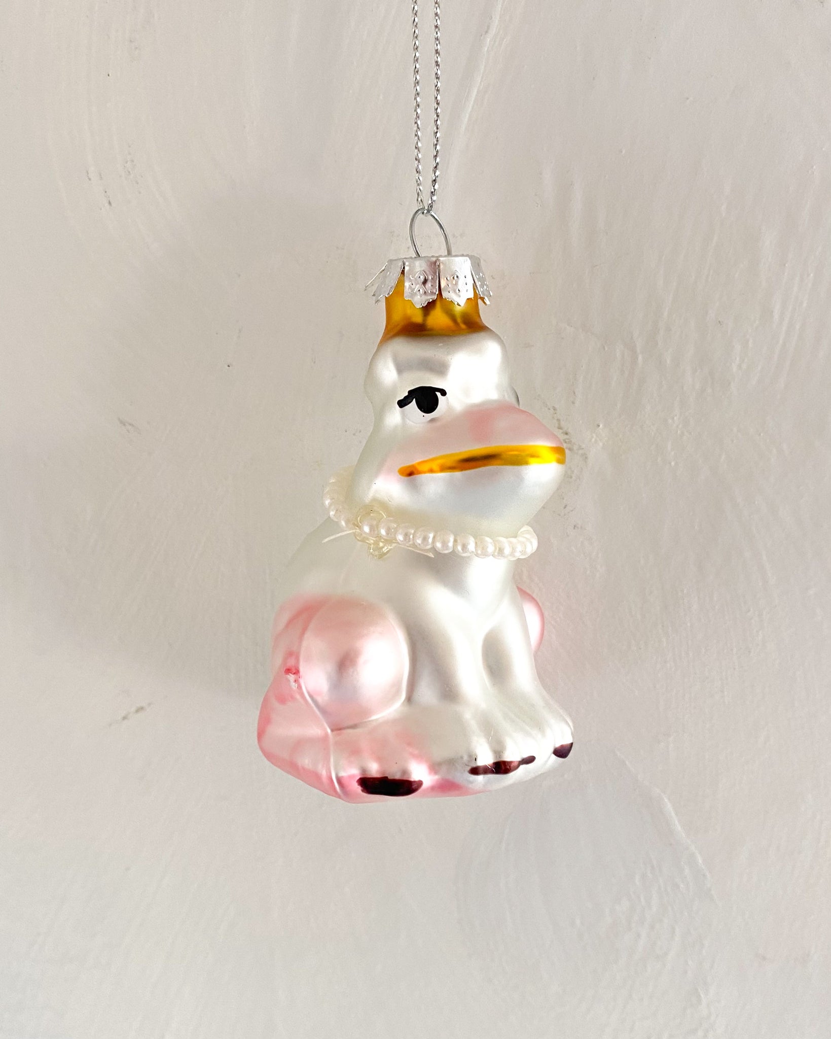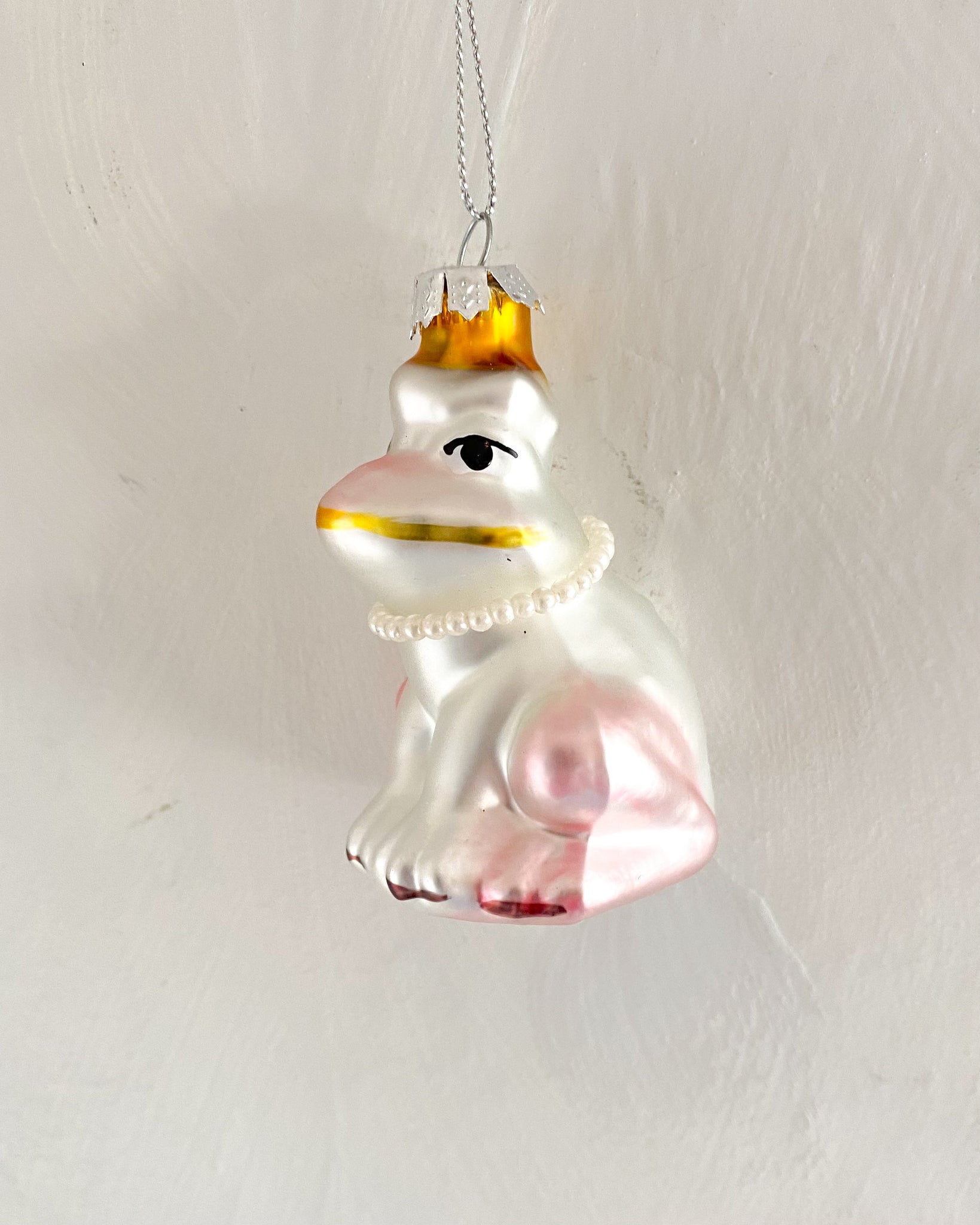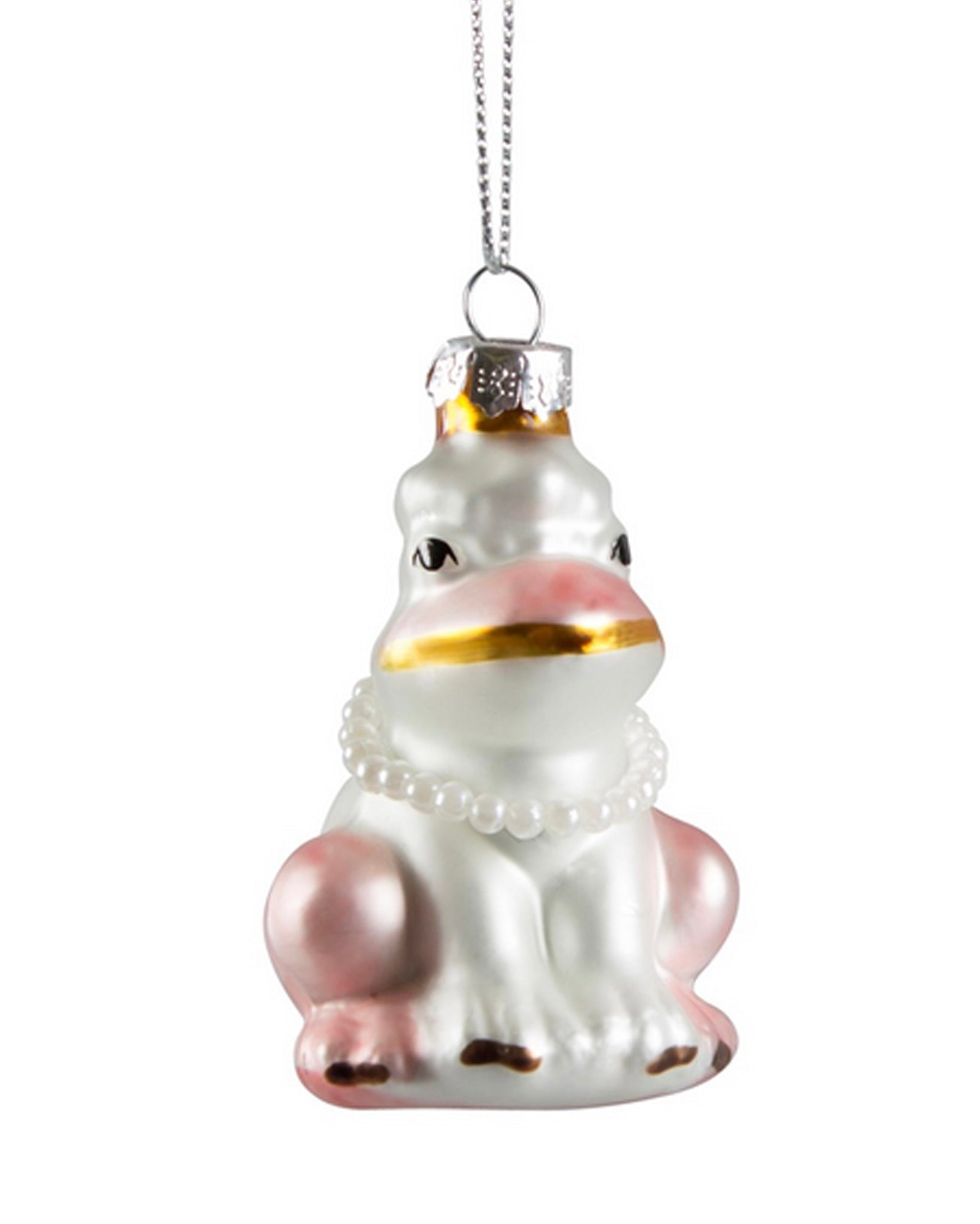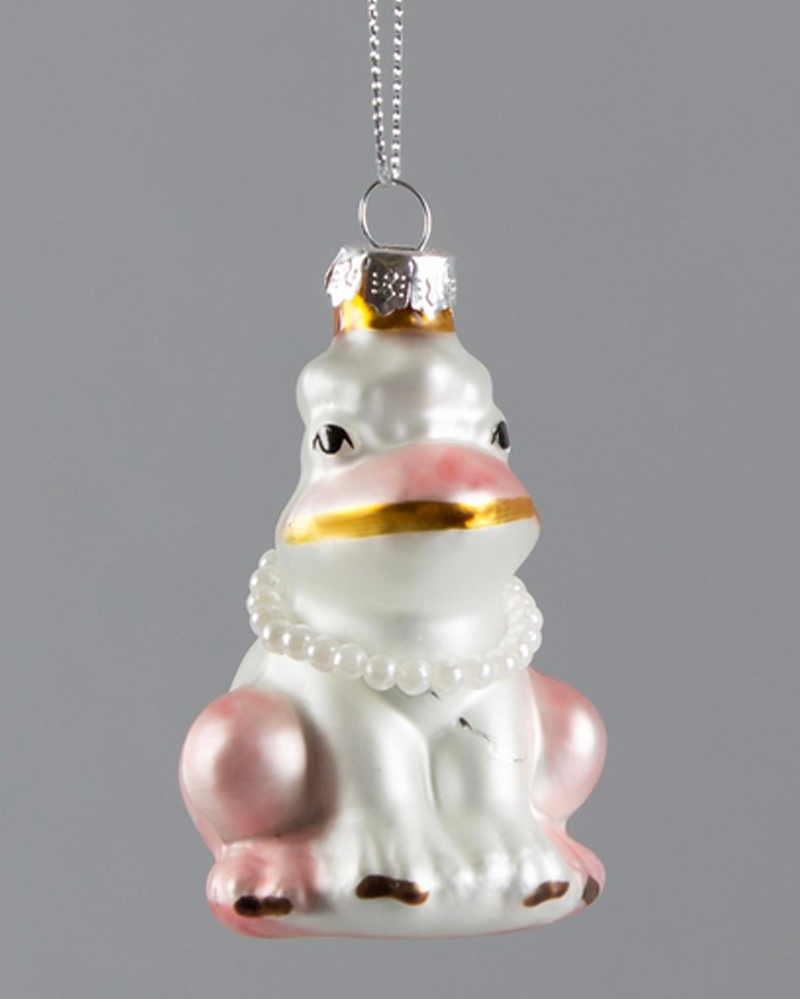 A Christmas tree ornament depicting a frog with a pearl necklace. Perfect for sprucing up the room or the Christmas tree.