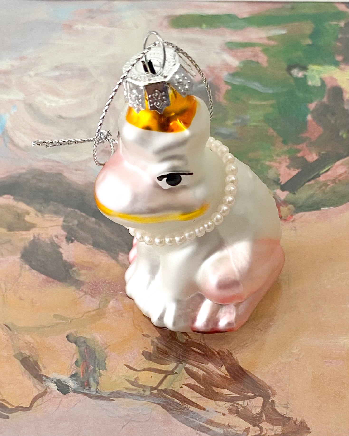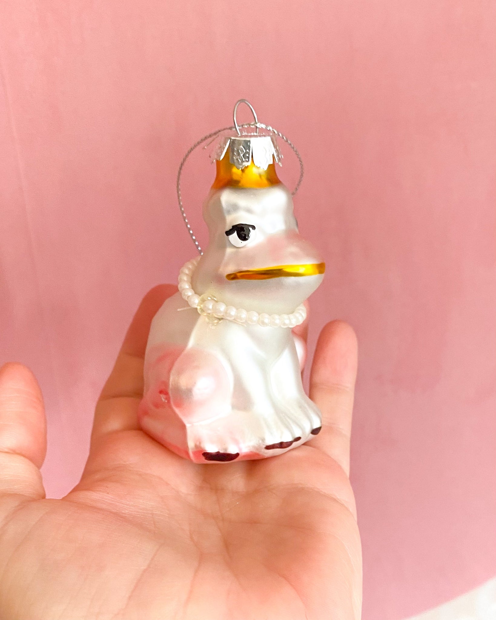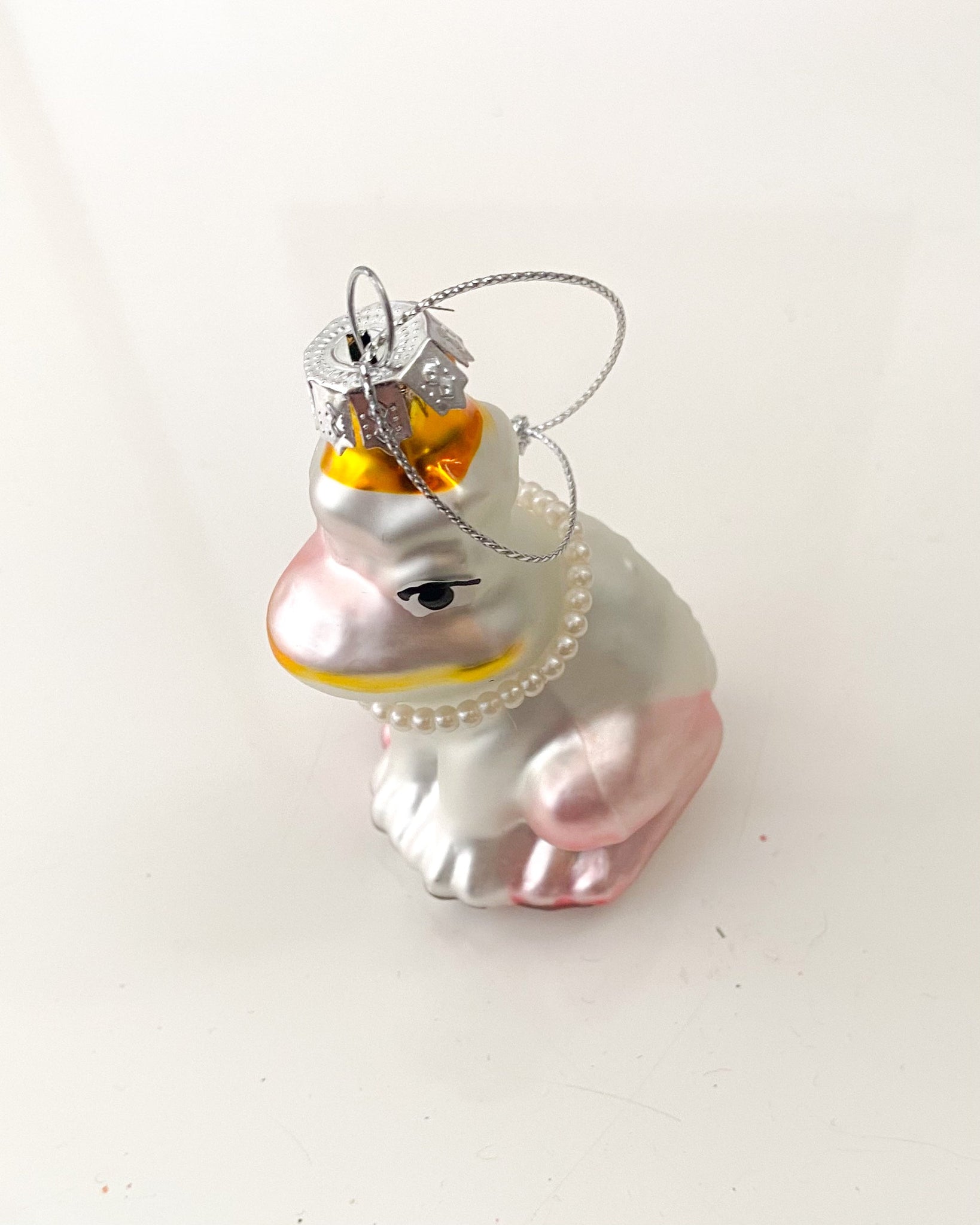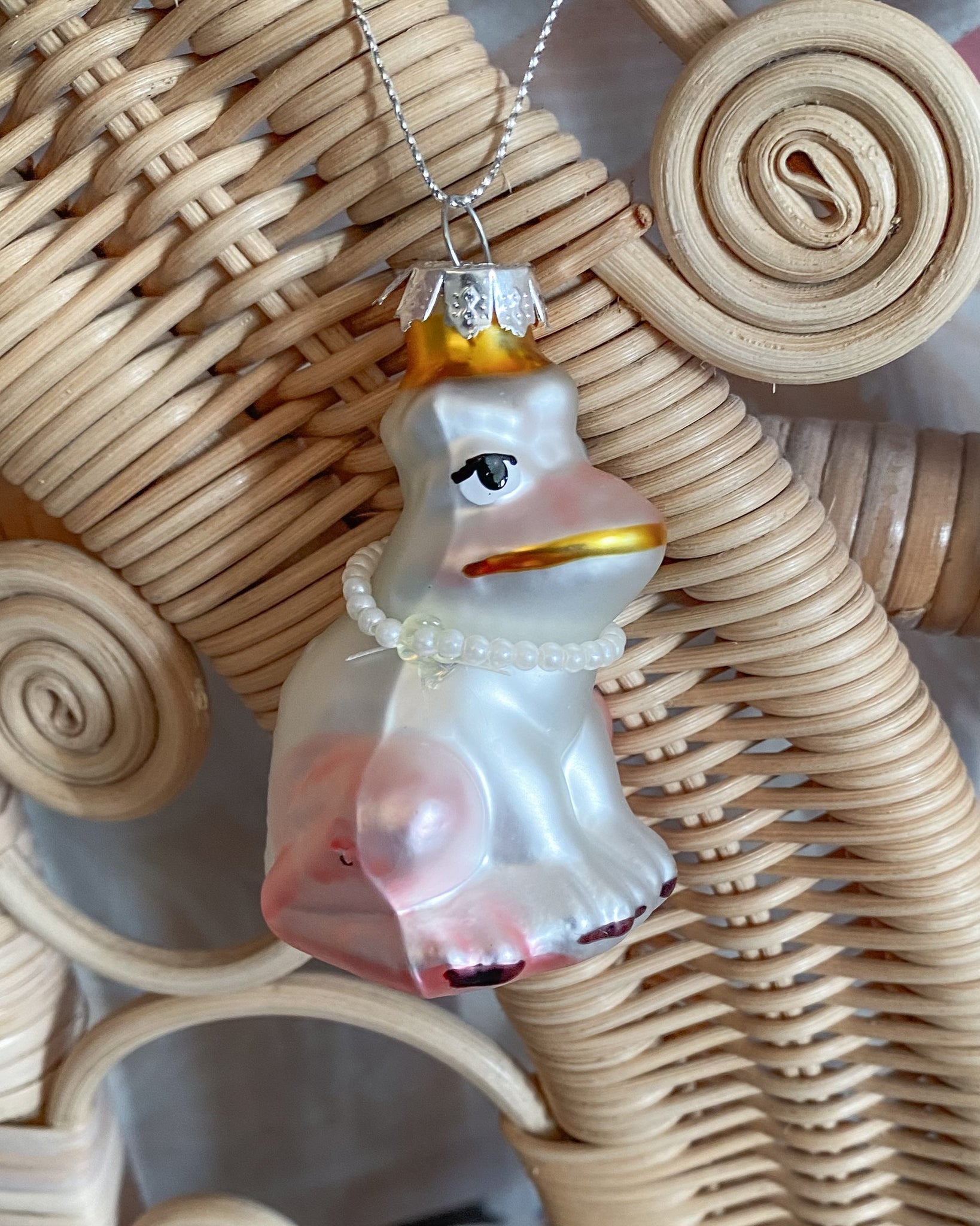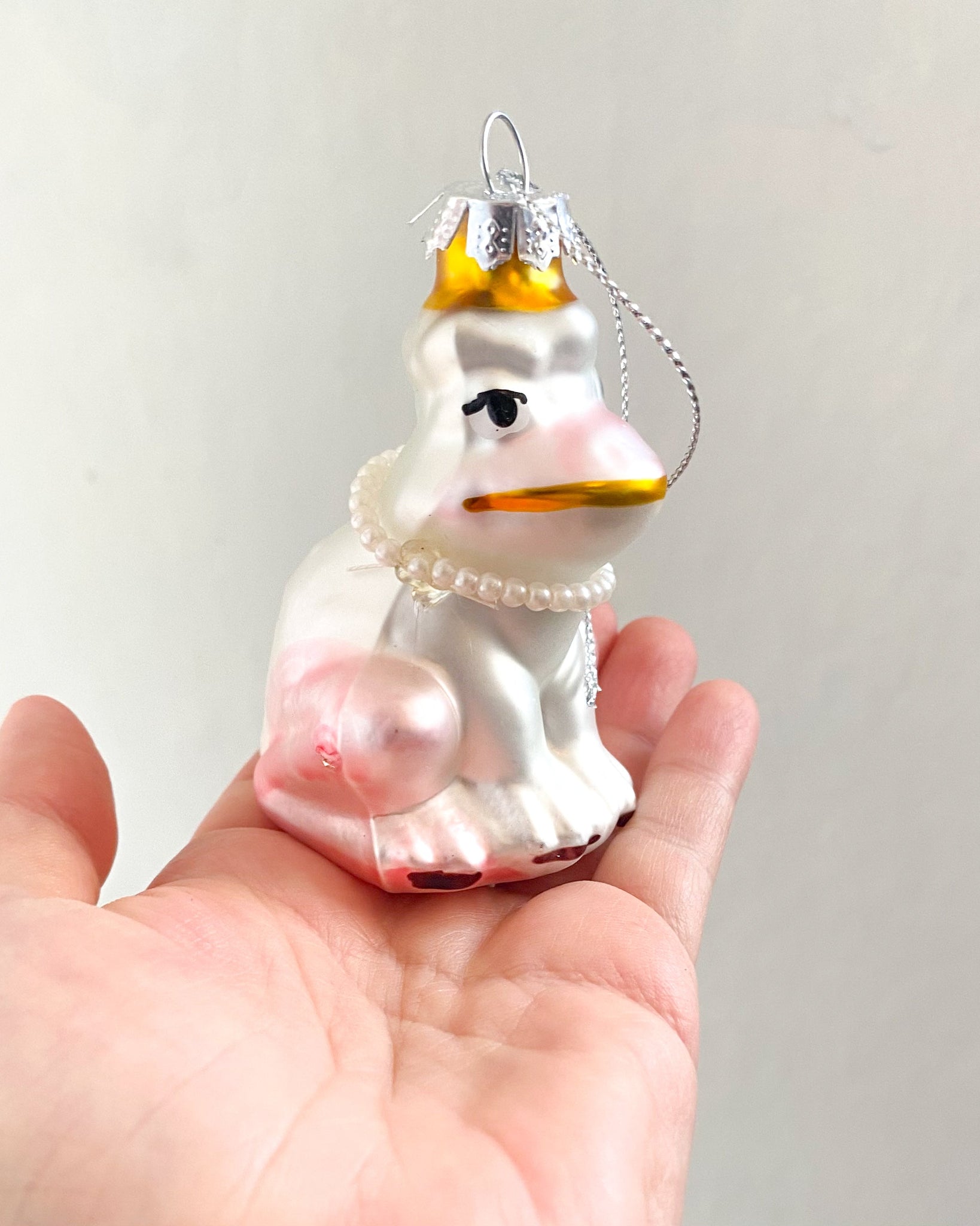 A Christmas tree ornament depicting a frog with a pearl necklace. Perfect for sprucing up the room or the Christmas tree.