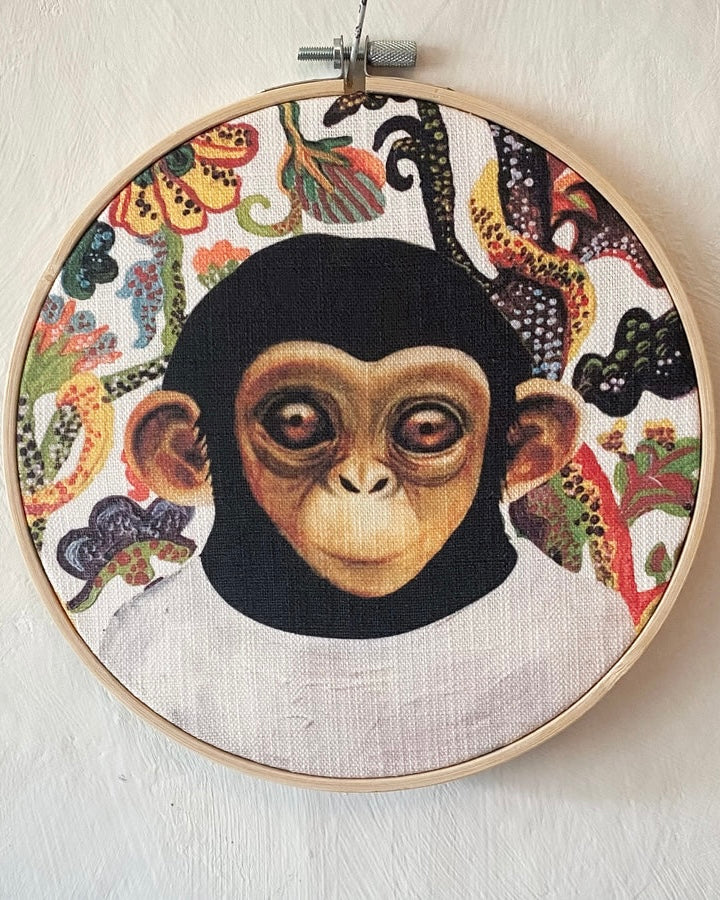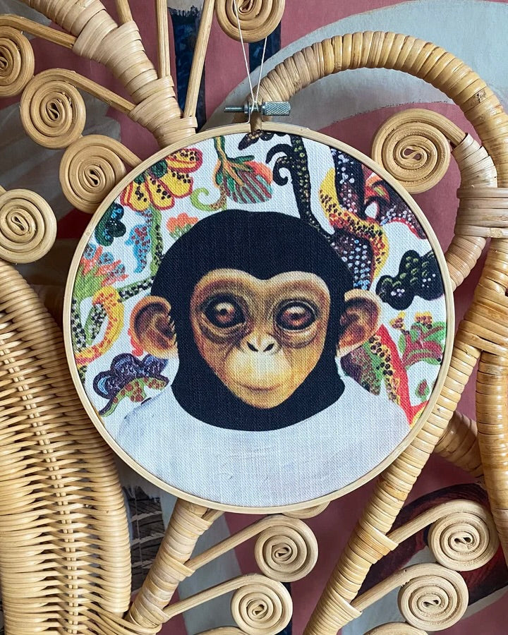 Printed linen-mixed fabric in a wooden frame.