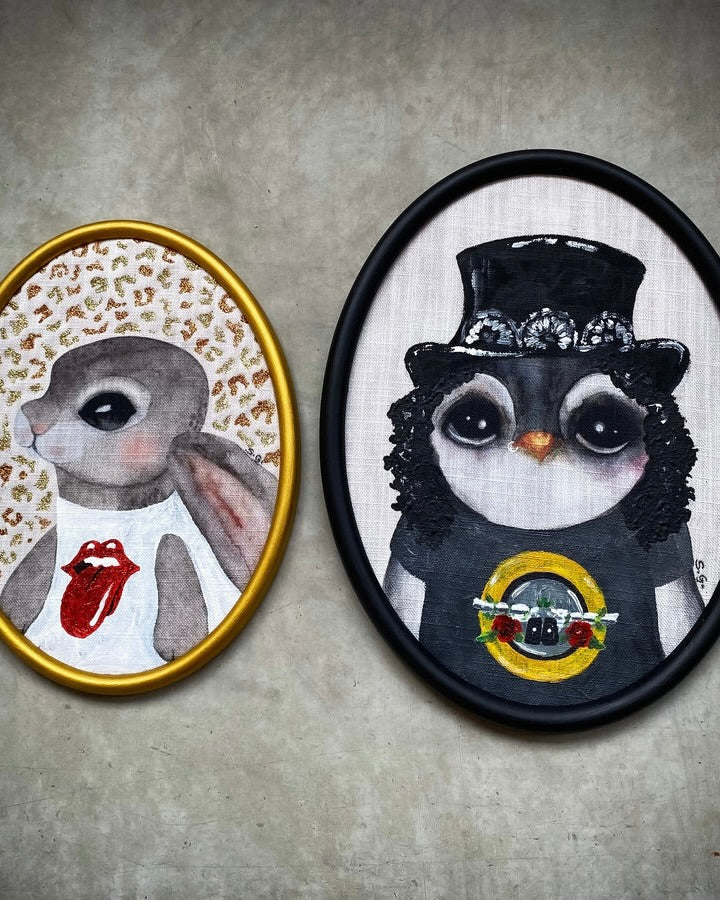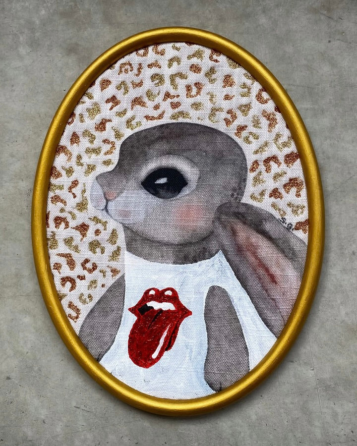 Angie! A musical little rabbit that gets its satisfaction from old English rock bands and of course leopard patterns. Preferably in gold glitter. Paint it, black! And gold.