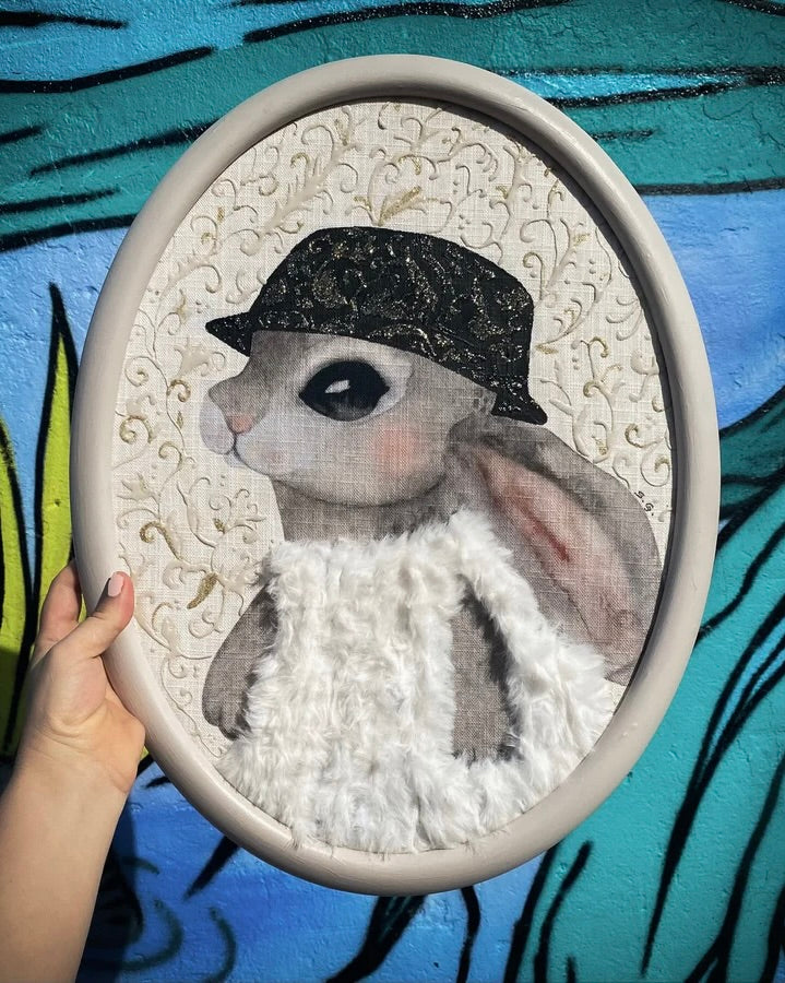 mounted in an antique wooden frame, repainted by hand. The sweater is made of a fluffy yarn.