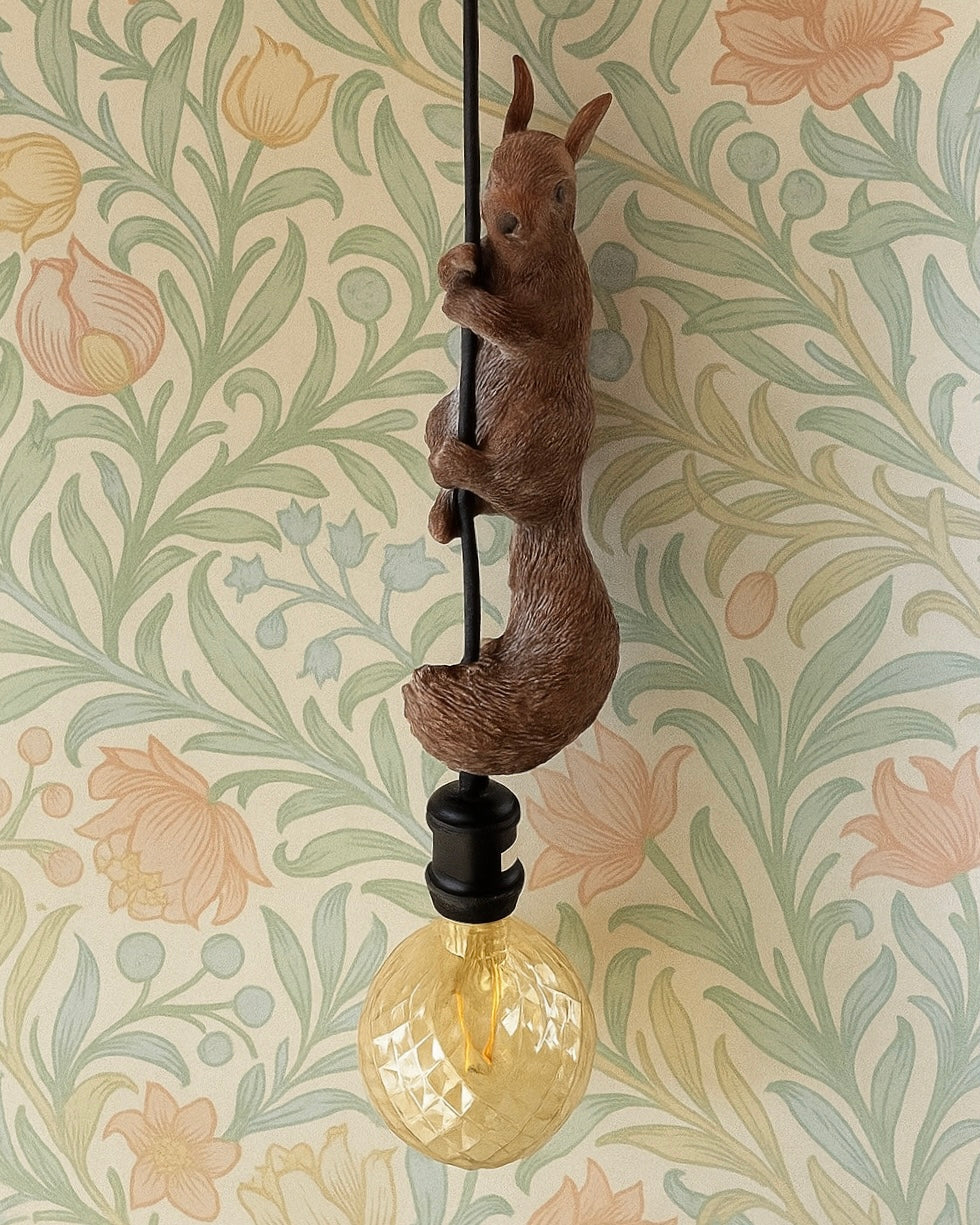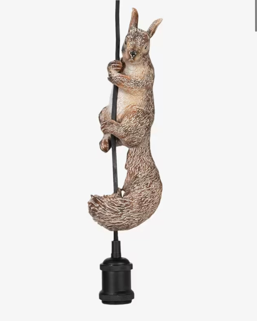 Lekfull taklampa med en ekorre som klättrar längs sladden.