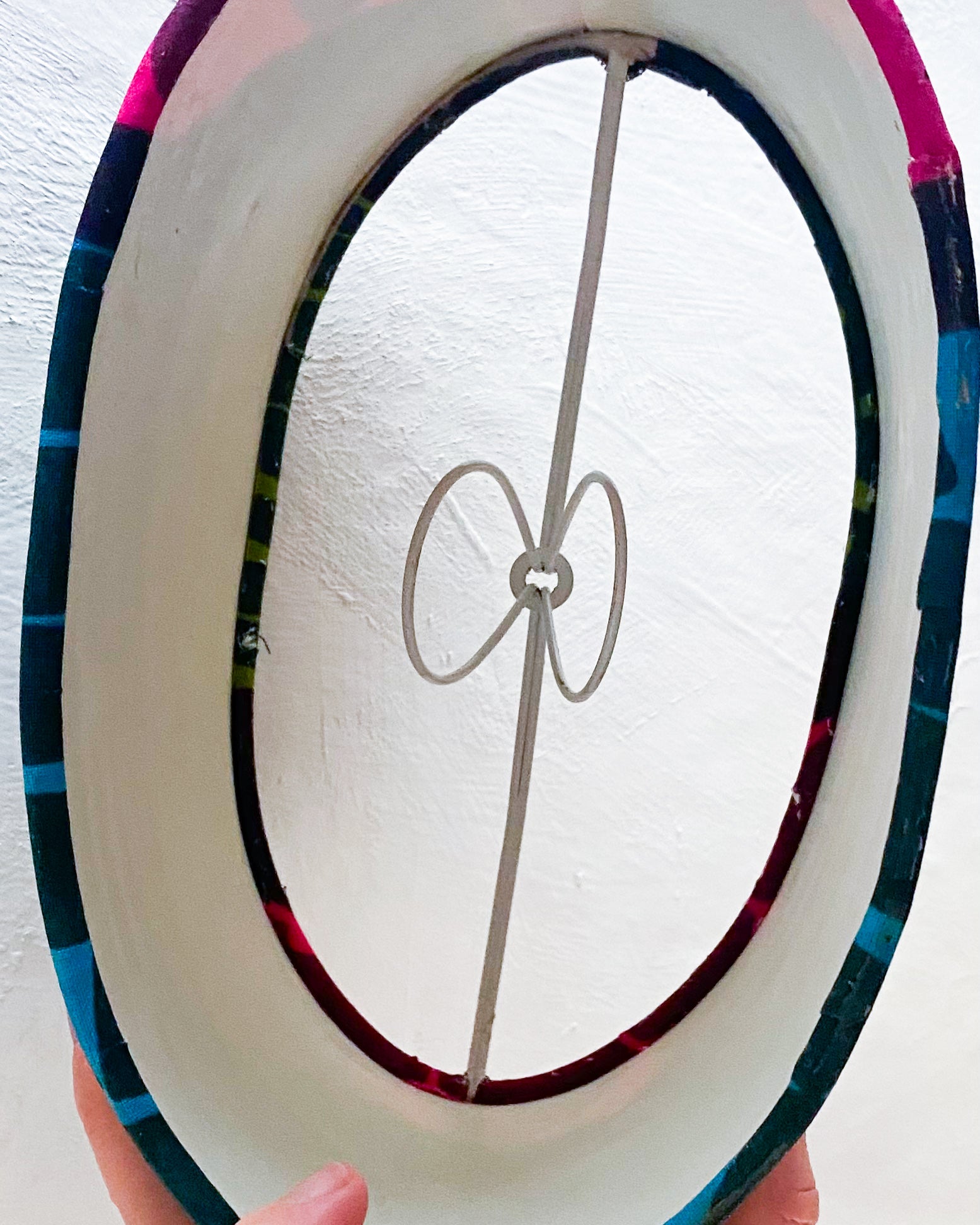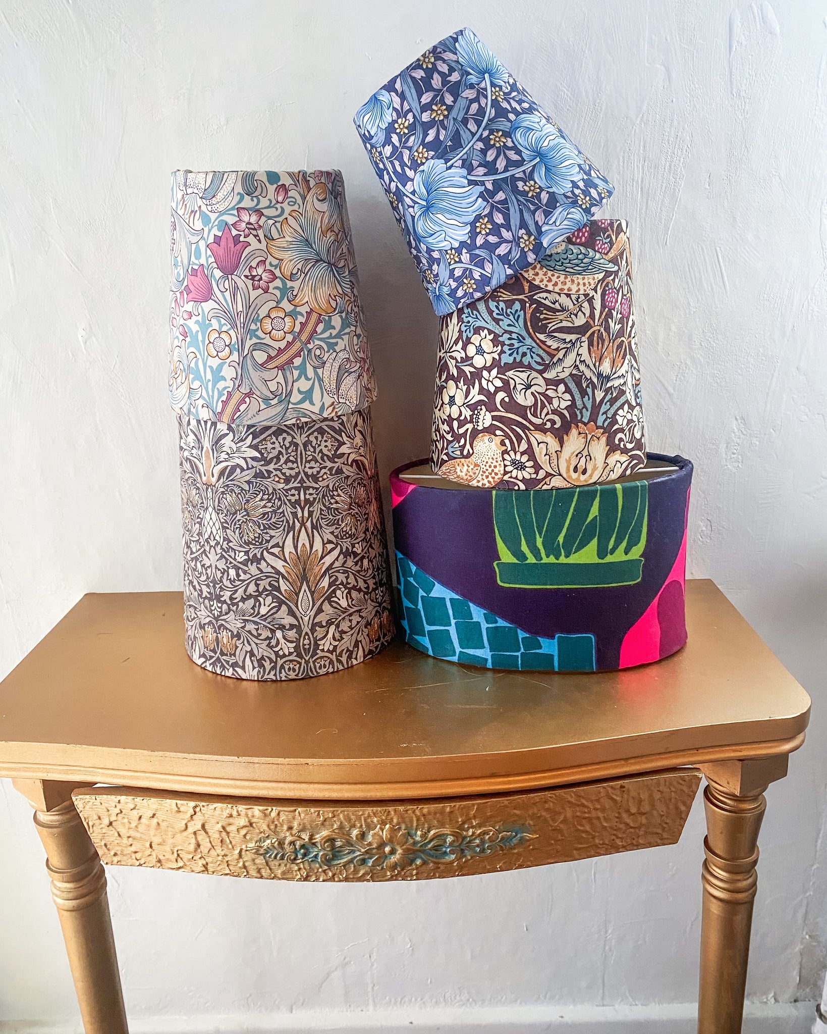 En lampskärm från second hand, omklädd i vackert tyg; Marinekkos ”purnukka”.