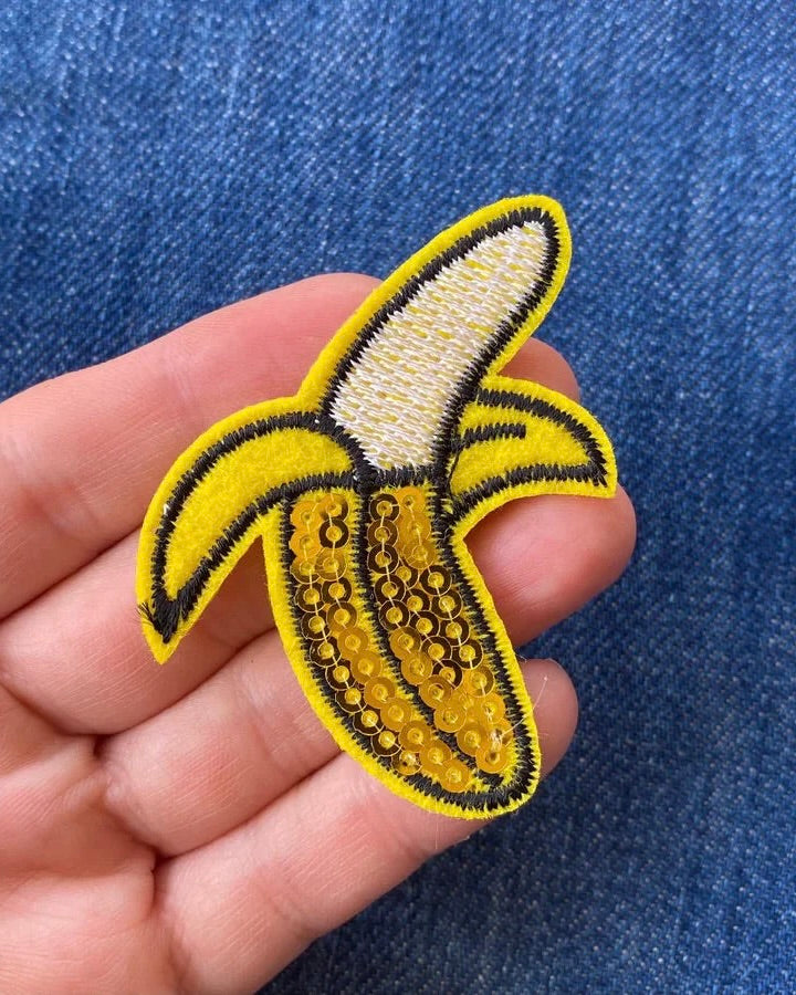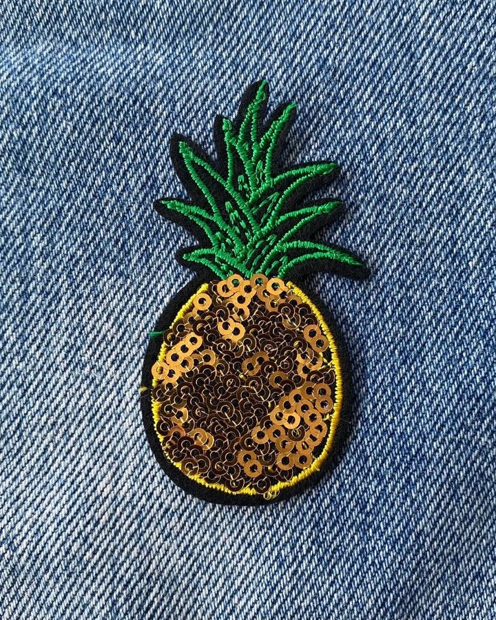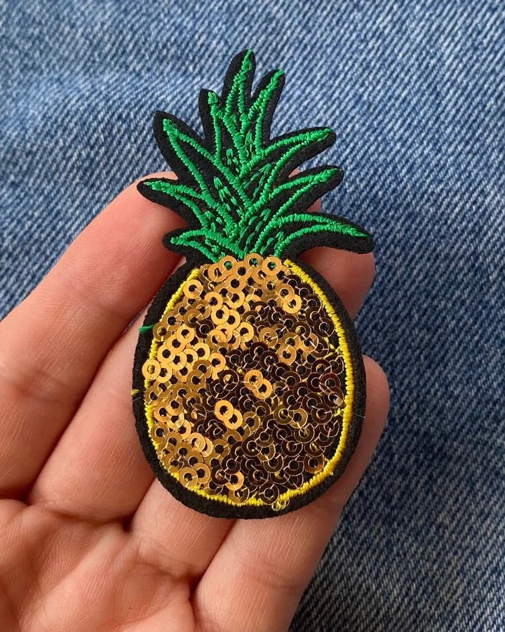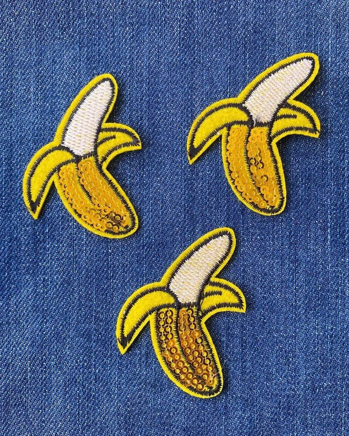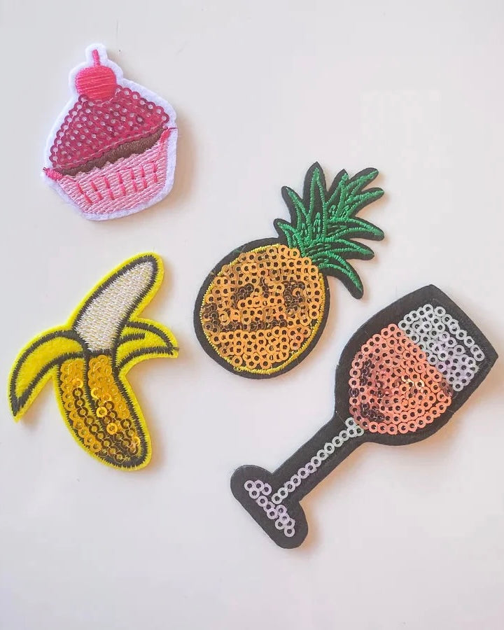 "Iron-on", stryk på-lappar i form av en ananas, muffins, banan och vinglas. Köp en och en eller hela setet.
